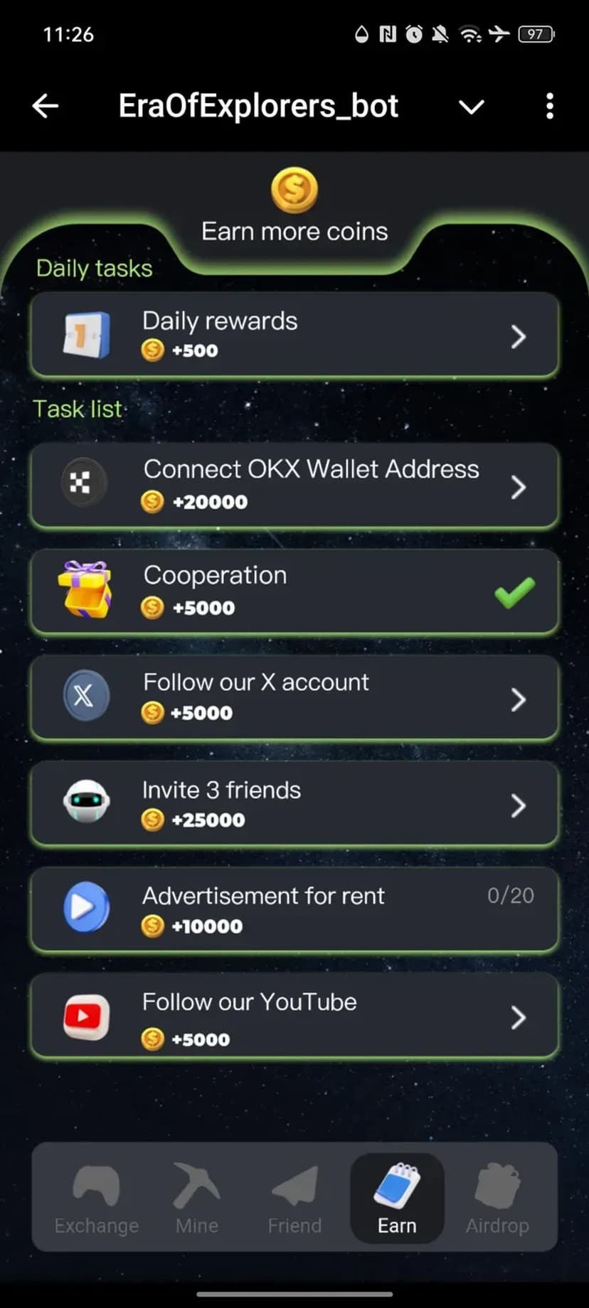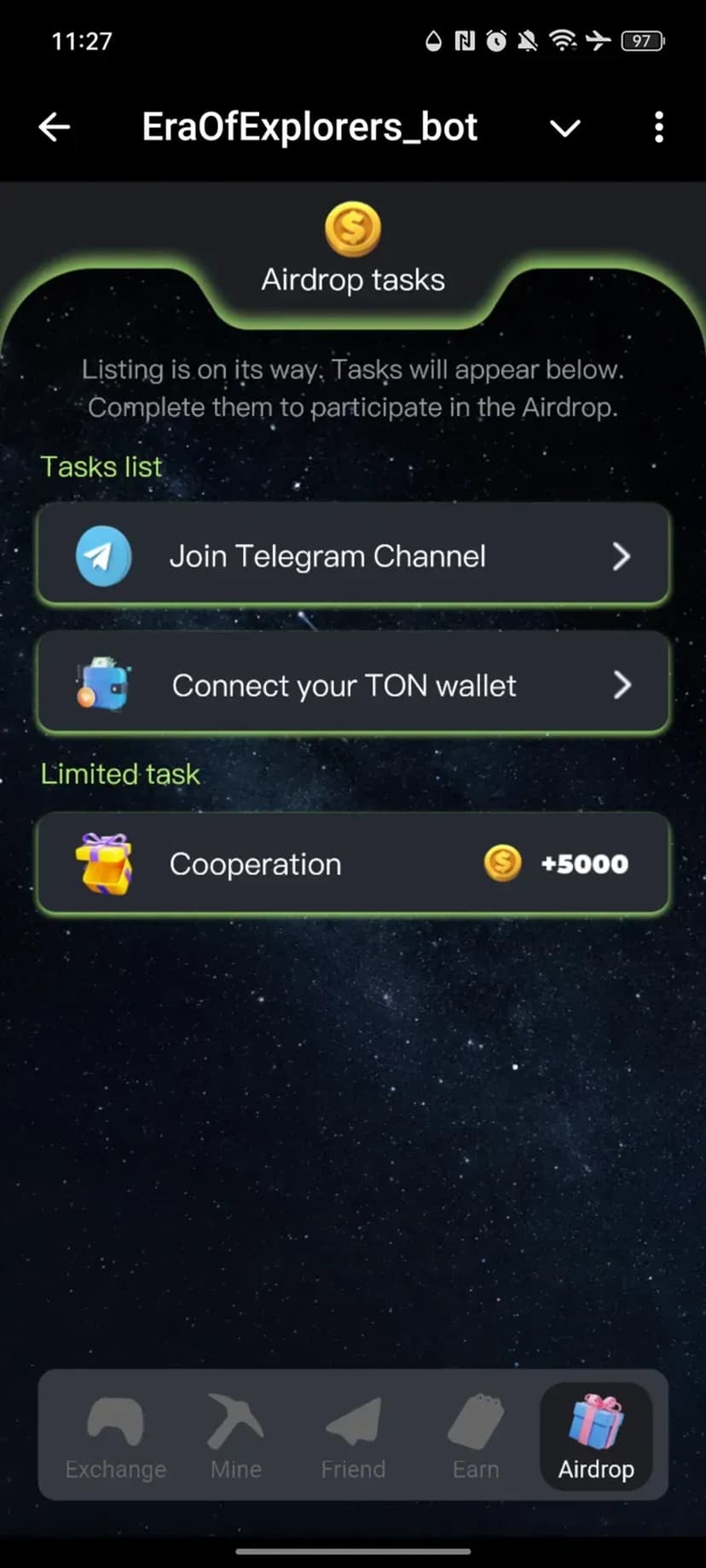 EraOfExplorers_bot сочетает космические исследования, NFT и экономику экосистемного токена прямо в Telegram. Игроки отправляются в межзвёздные экспедиции, открывают новые планеты и управляют уникальными космическими кораблями в формате NFT.