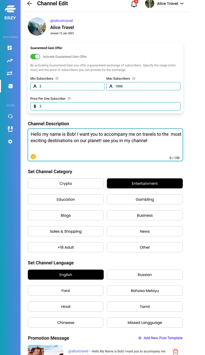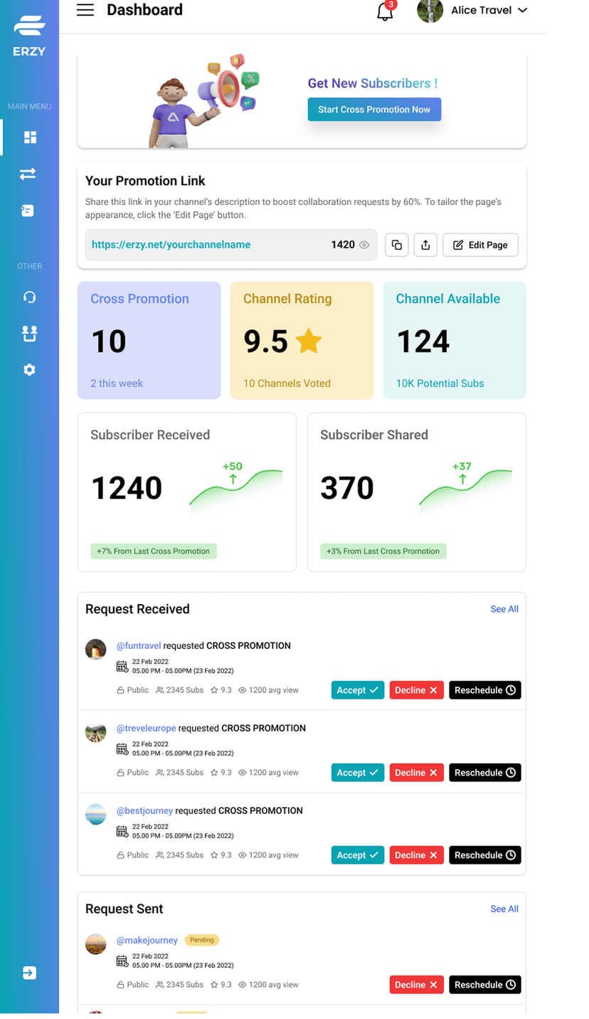 Erzy Channel Collab помогает администраторам каналов проводить взаимный пиар и коллаборации с гарантией результата, автоматизируя поиск партнёров и делая условия сотрудничества прозрачными.