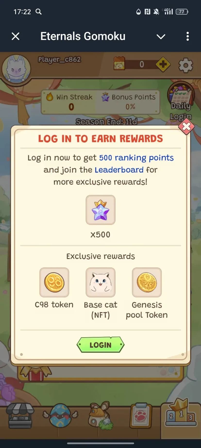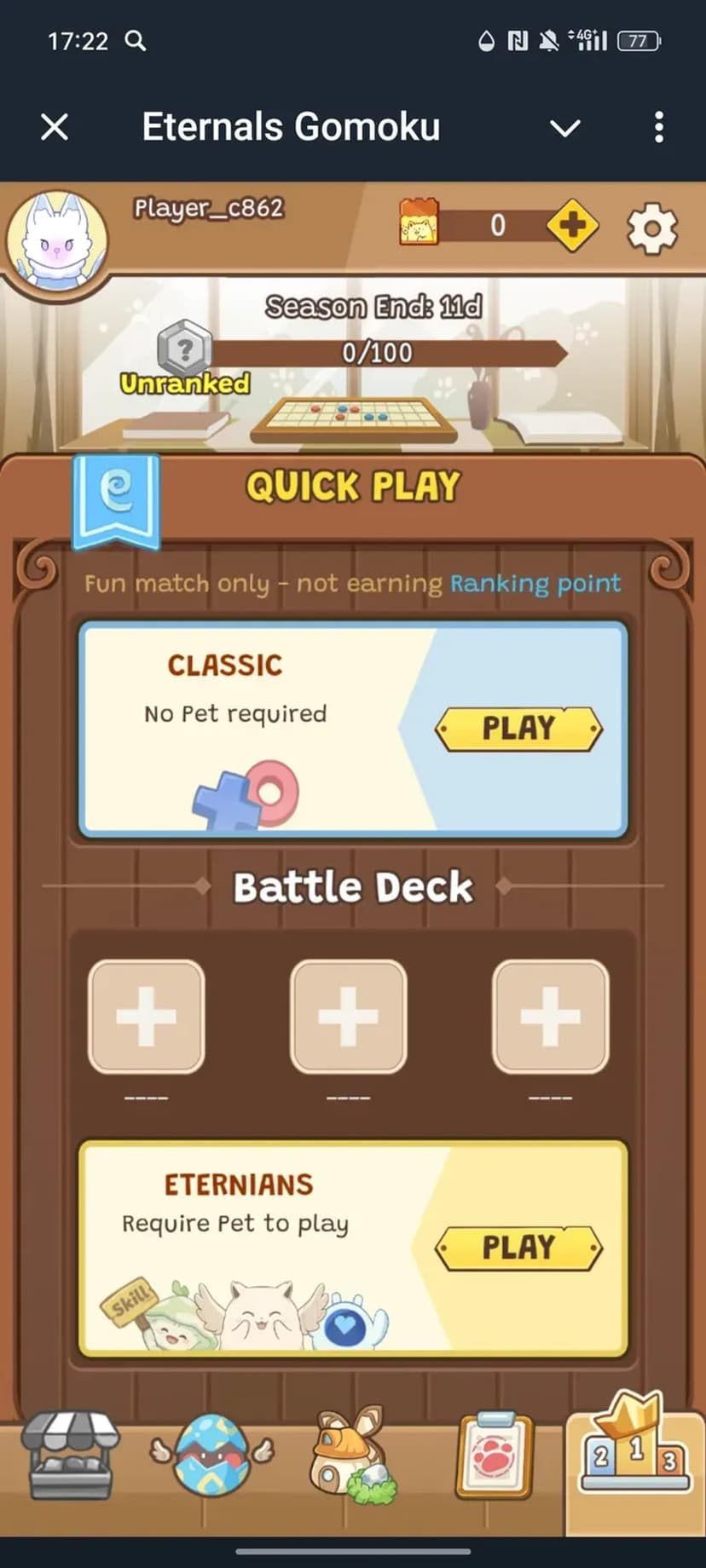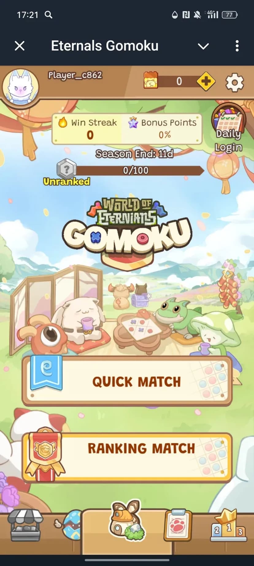Eternals Gomoku — версия классической игры «Гомоку», где задача — выстроить ряд из пяти фишек, используя тактику и умения коллекционных питомцев.