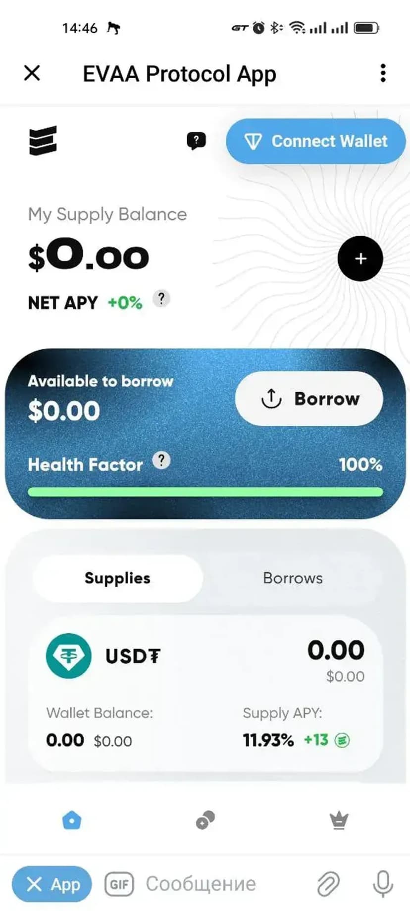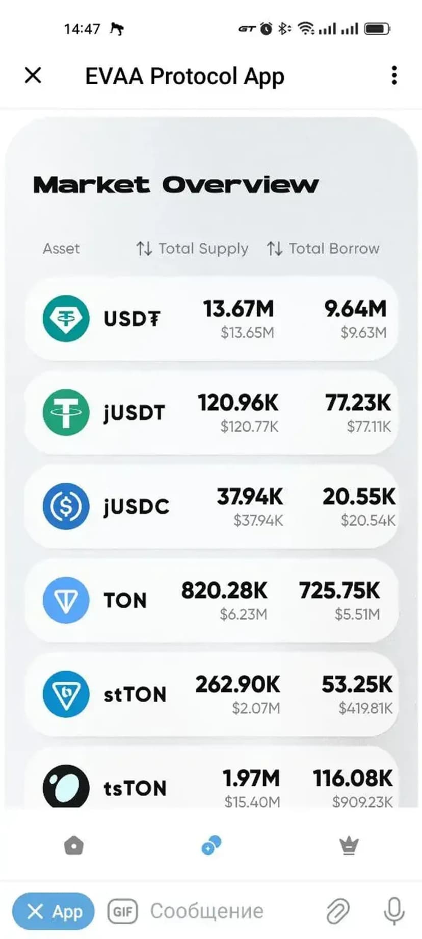 EVAA Protocol App — первый лендинговый протокол TON, предоставляющий быстрый доступ к операциям по кредитованию и заимствованию криптовалюты напрямую внутри мессенджера. Сервис сочетает простоту взаимодействия и работу на официальном протоколе Evaa, зарекомендовав себя у более 18 000 ежемесячных пользователей.