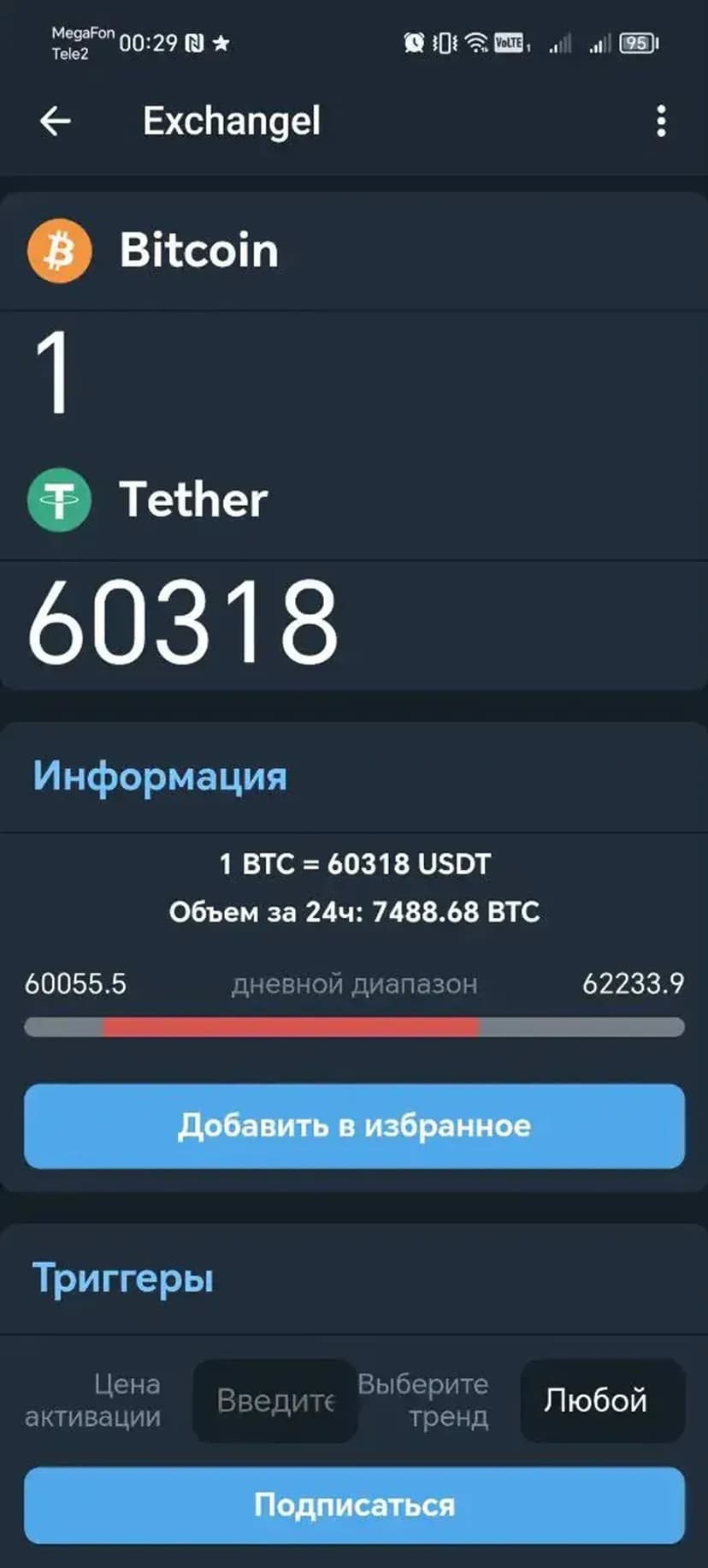Exchangel мгновенно рассчитывает стоимость криптовалют с опорой на актуальные биржевые курсы. Приложение позволяет быстро конвертировать суммы цифровых активов в фиатные и другие поддерживаемые валюты без дополнительной регистрации — достаточно доступа к Telegram.