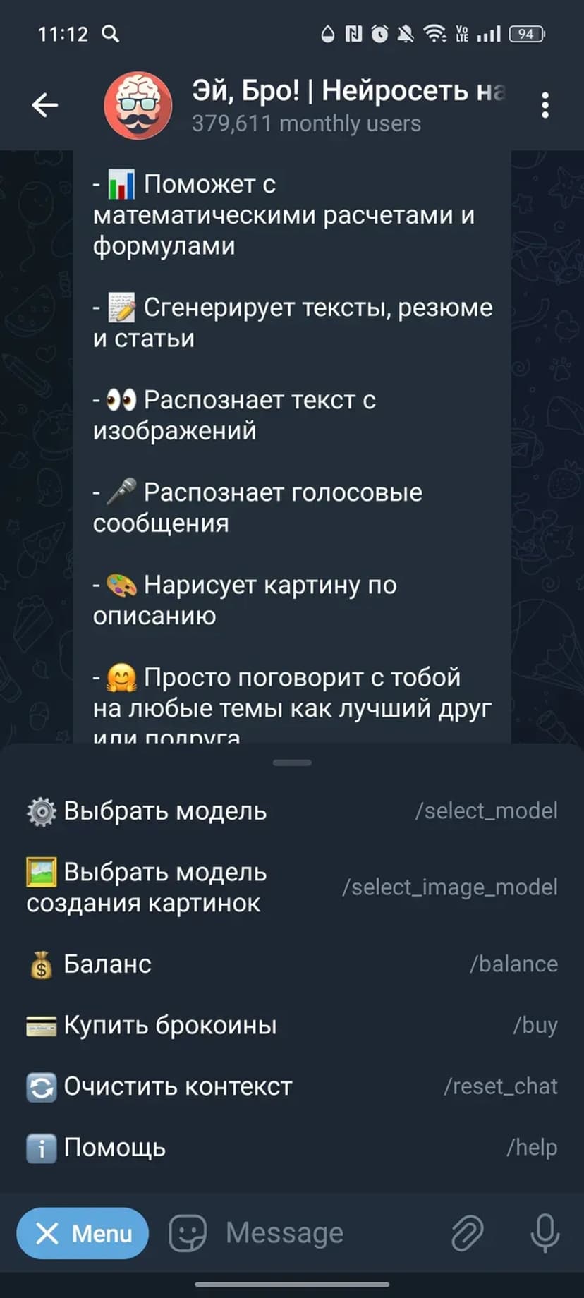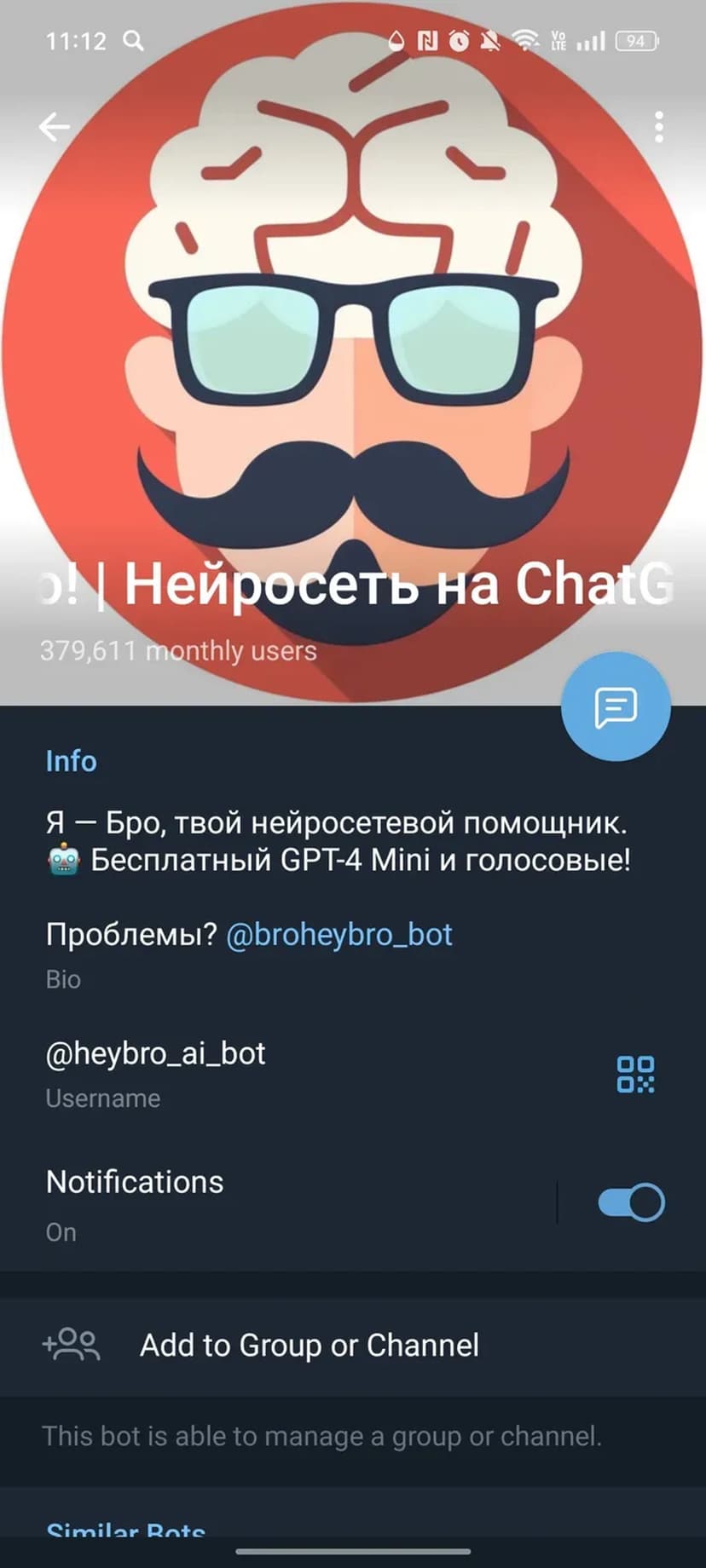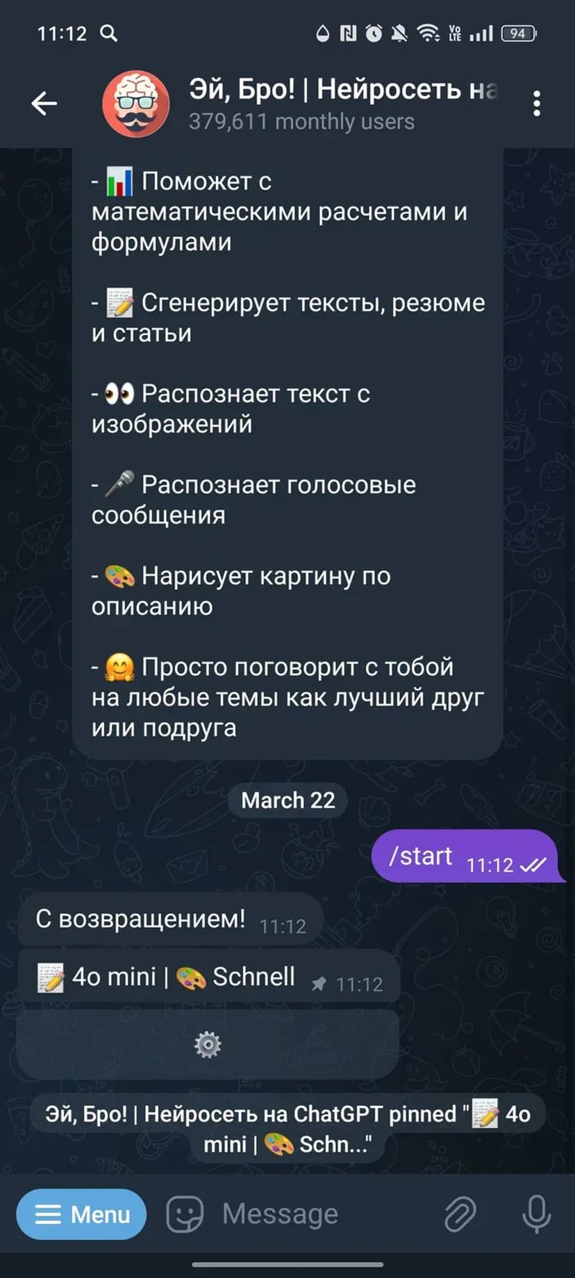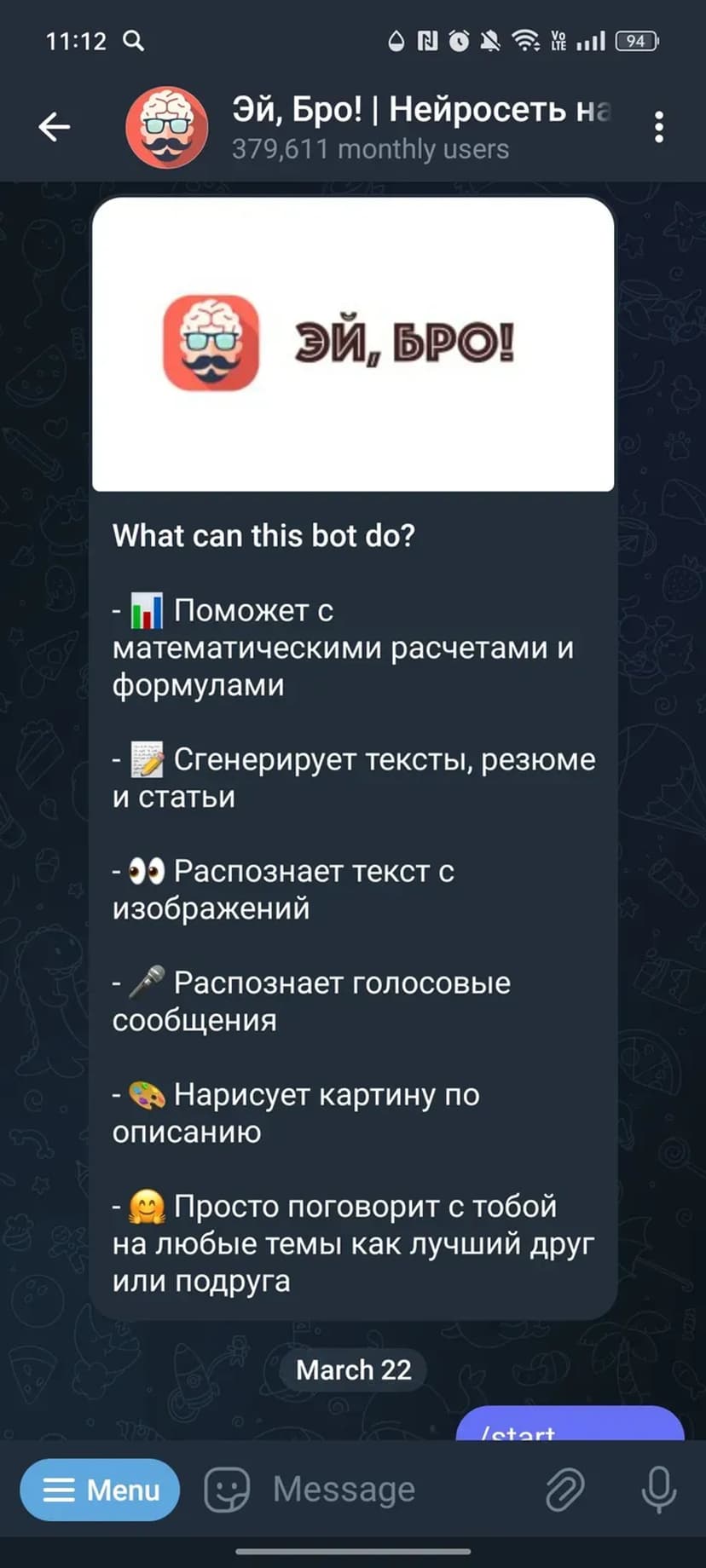 Эй, Бро! — нейросетевой помощник на базе GPT-4 Mini, доступный в виде Telegram-бота. Отвечает на текстовые и голосовые запросы: отправьте сообщение или голосовую запись и получите быстрый отклик от ИИ.