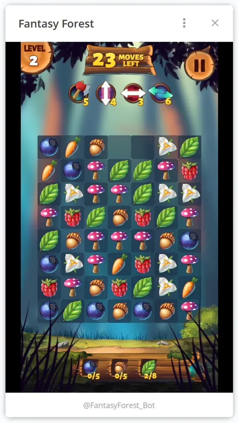 Fantasy Forest — семейная игра в жанре match-3 с атмосферой волшебного леса: яркая анимация и интуитивный, дружелюбный интерфейс.