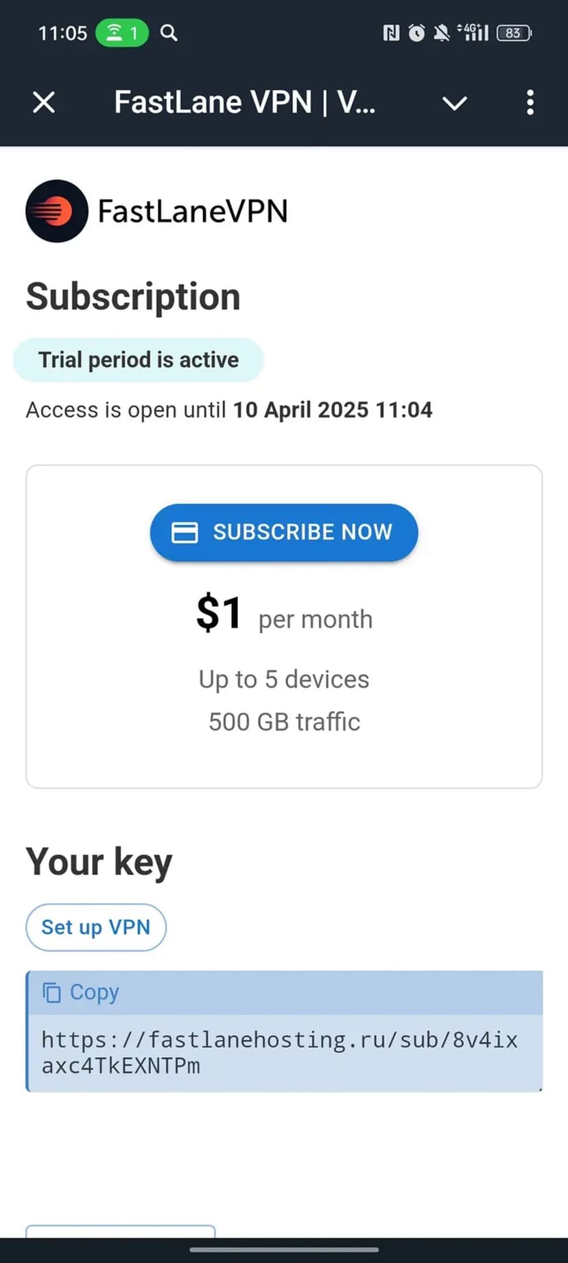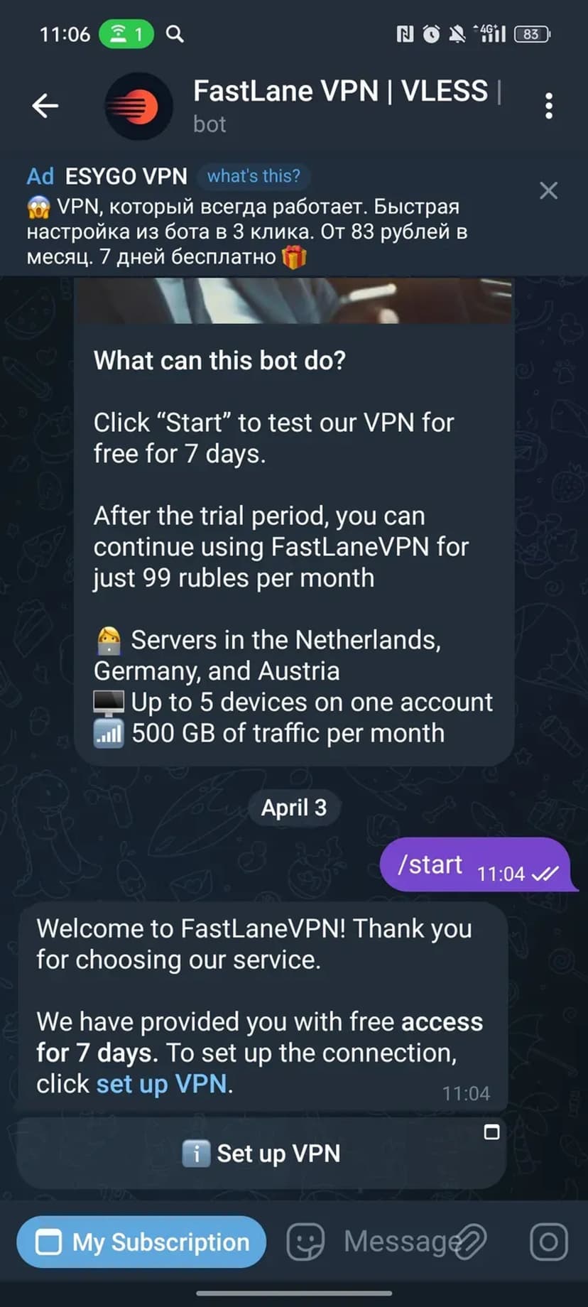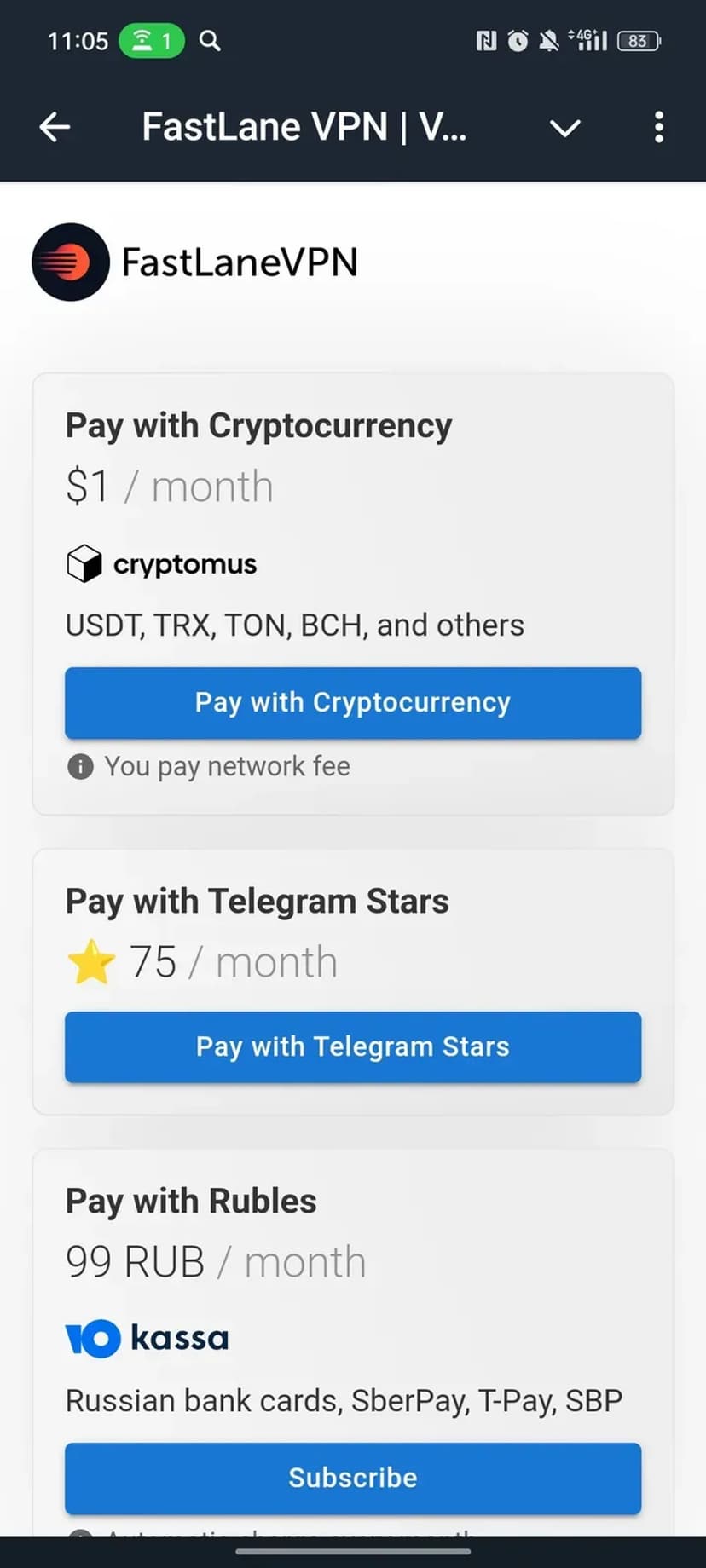 FastLane VPN предоставляет быстрый способ получить конфигурации и управлять подпиской на VPN с поддержкой протоколов VLESS и v2RayTun прямо через Telegram.