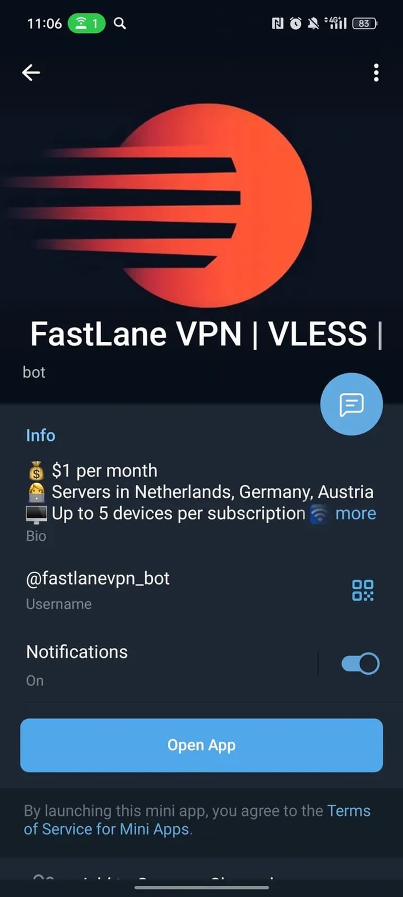 *Нажимая "Открыть в Telegram", вы перейдете к приложению FastLane VPN в мессенджере Telegram