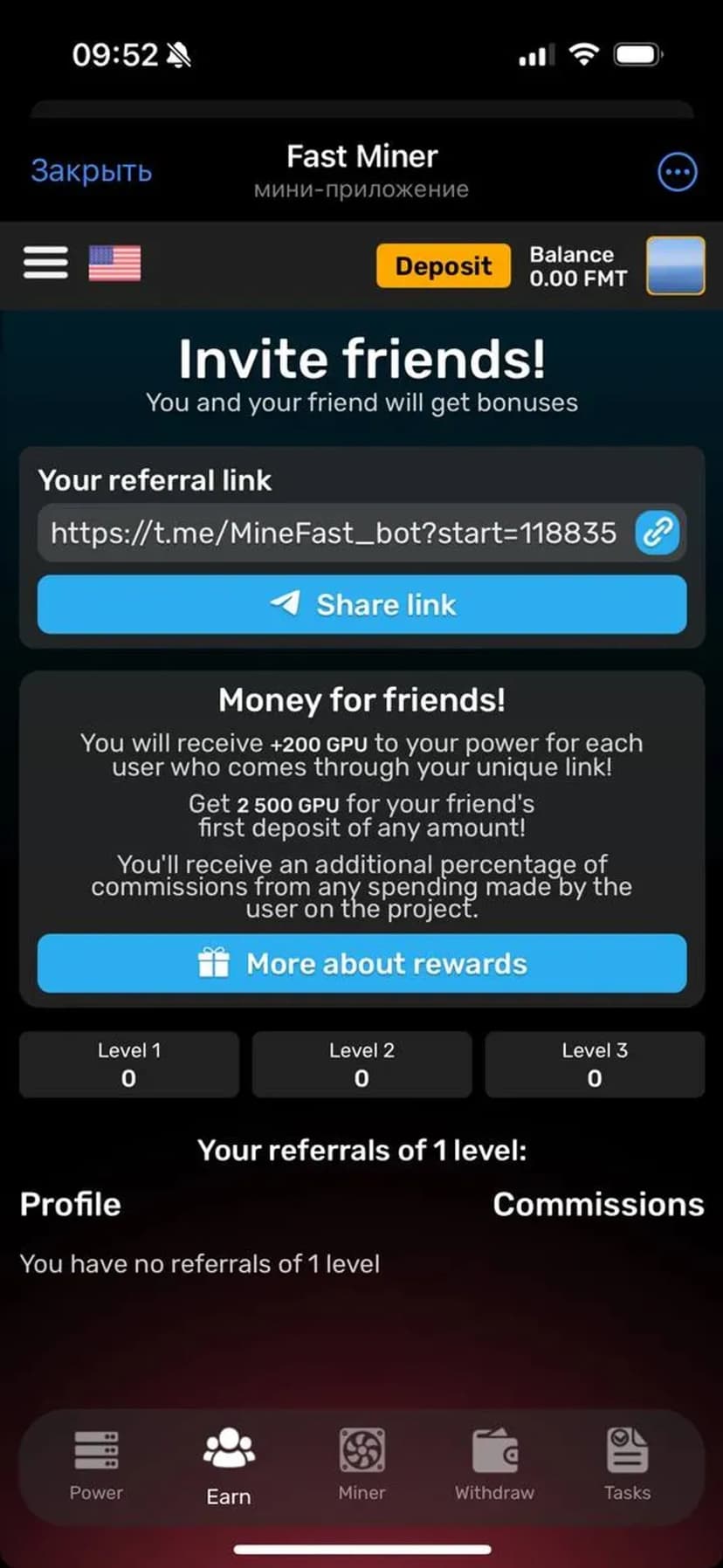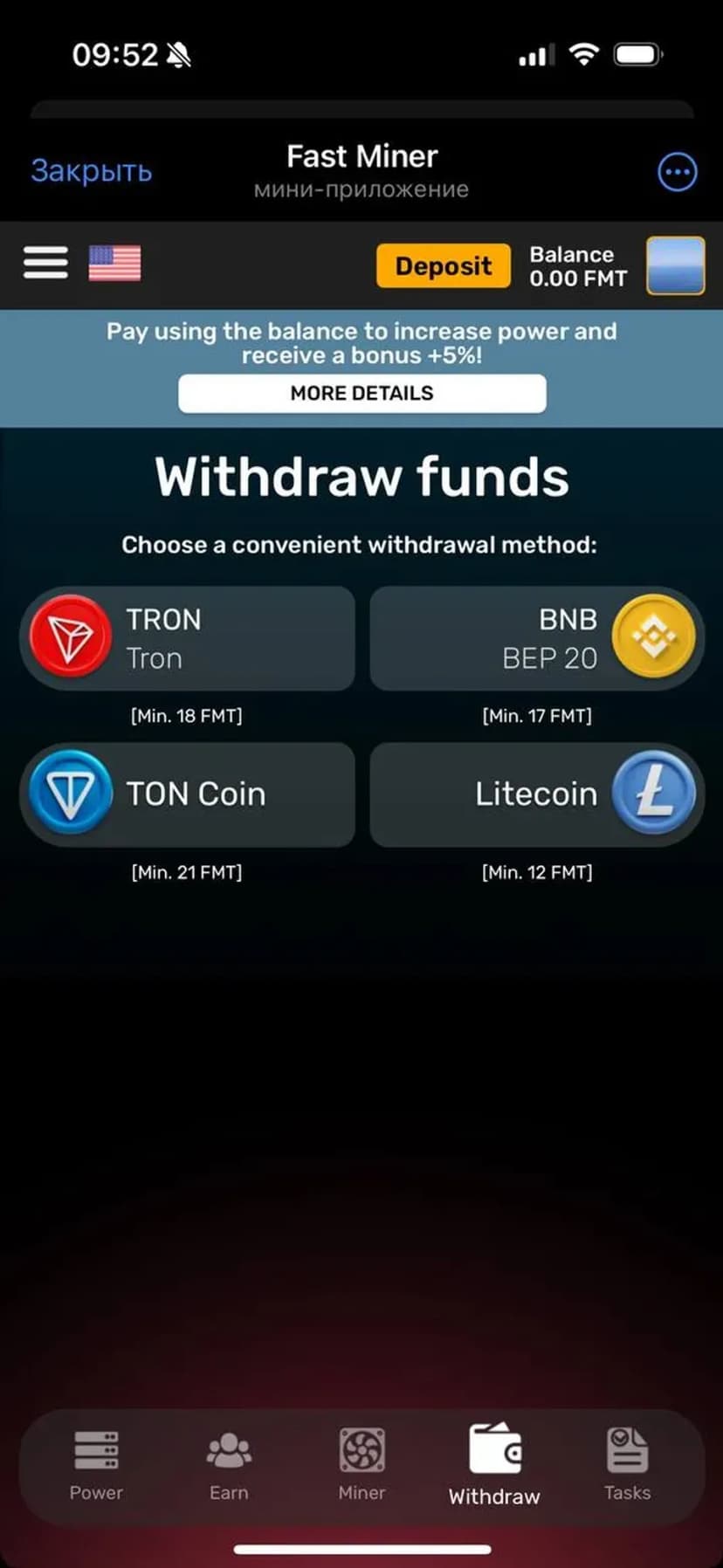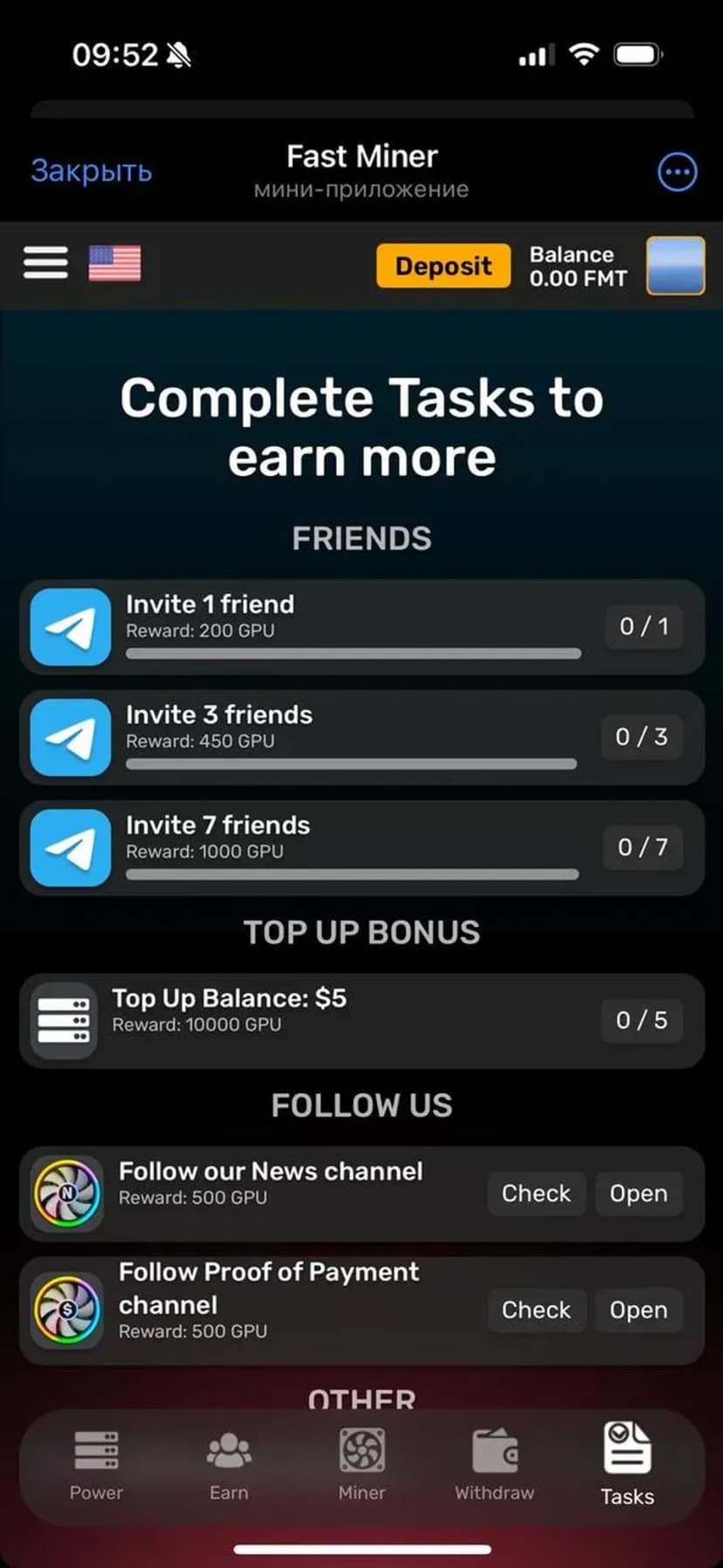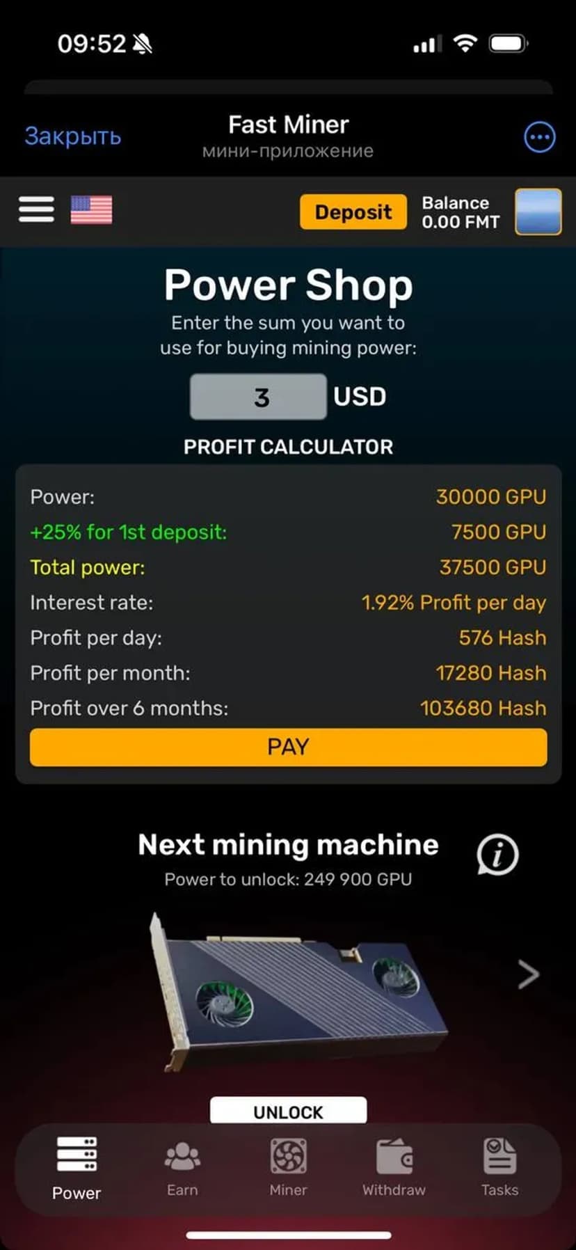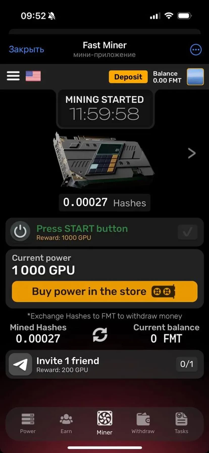 *Нажимая "Открыть в Telegram", вы перейдете к приложению Fast Miner в мессенджере Telegram