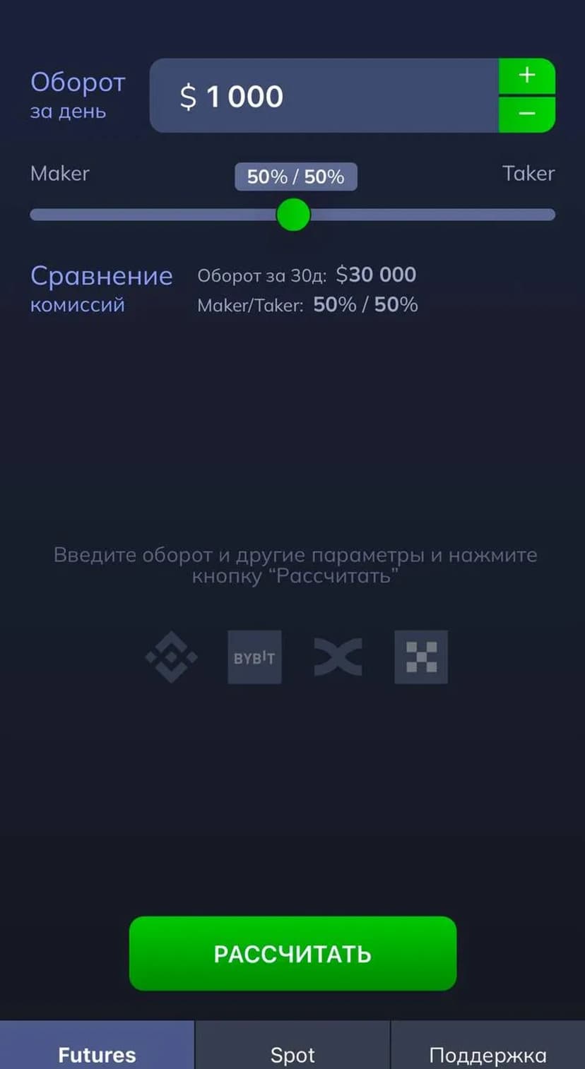 Моментальный расчёт комиссий бирж по введённому объёму торгов.