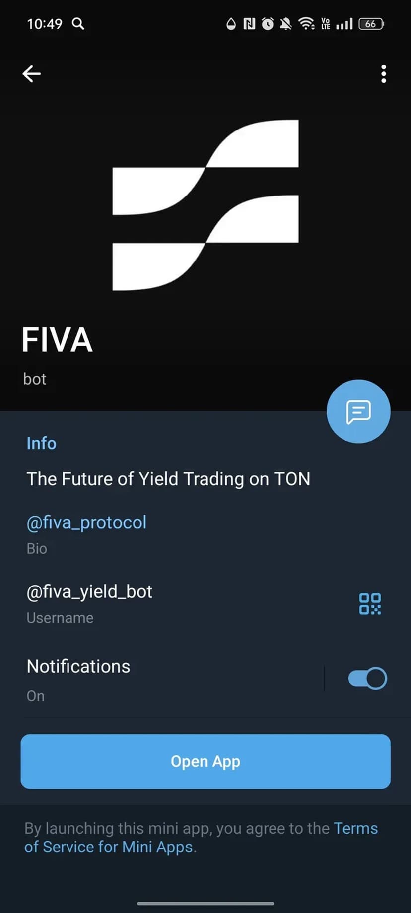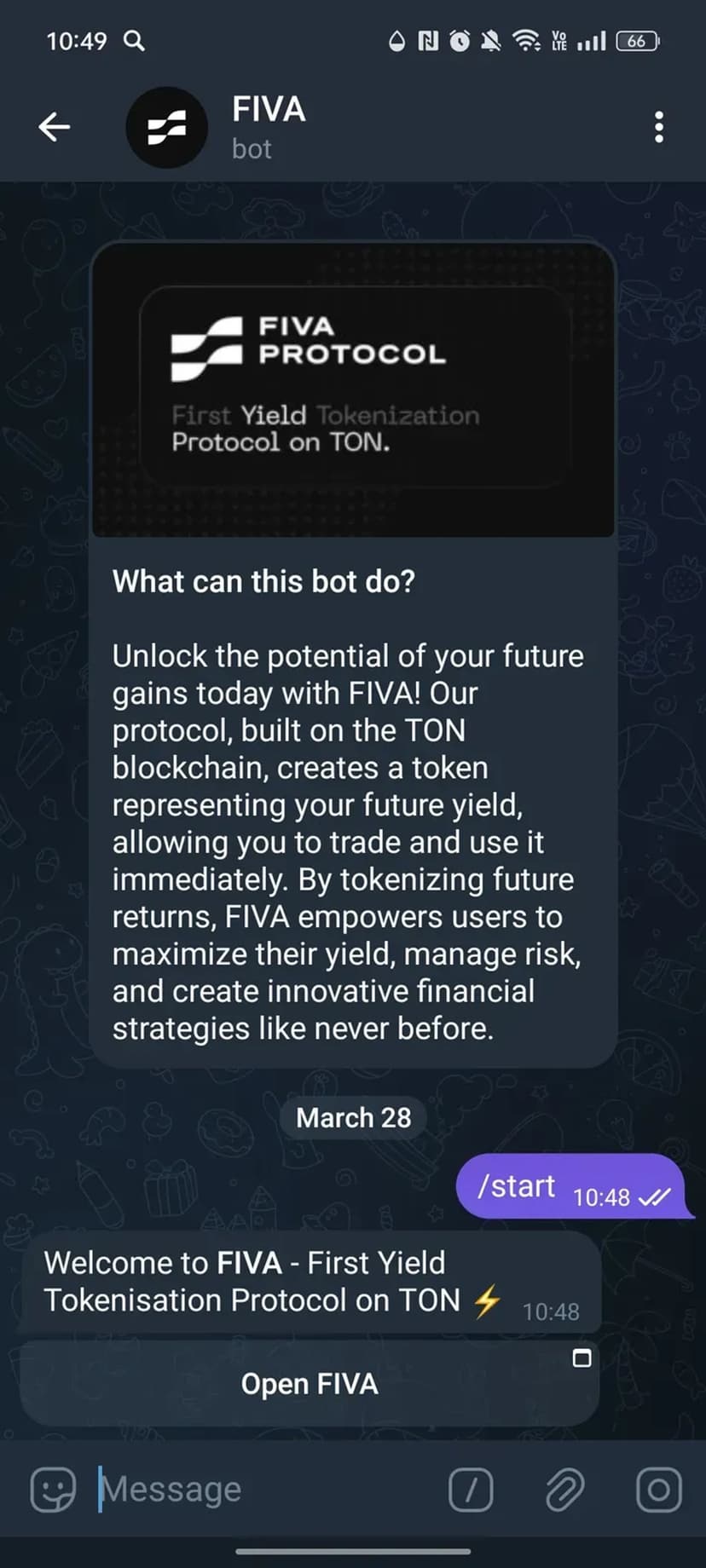 FIVA — сервис внутри Telegram, который позволяет получать фиксированный доход в долларах США через механизм токенизации доходности. Управление инвестициями происходит через бота без необходимости установки отдельного приложения или сложной регистрации.
