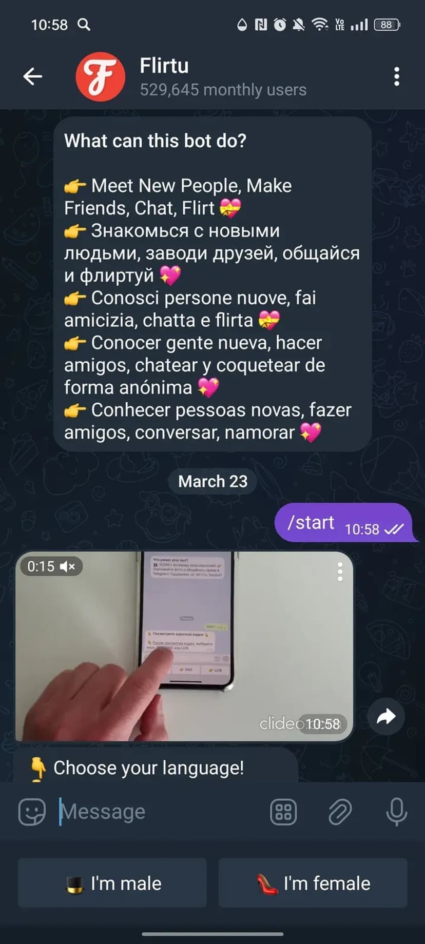 Flirtu интегрируется в Telegram и помогает быстро находить новых собеседников и знакомиться в защищённом чате. Регистрация проходит через аккаунт Telegram, после чего можно создать профиль, просматривать анкеты других пользователей и начинать общение без перехода в отдельные приложения.