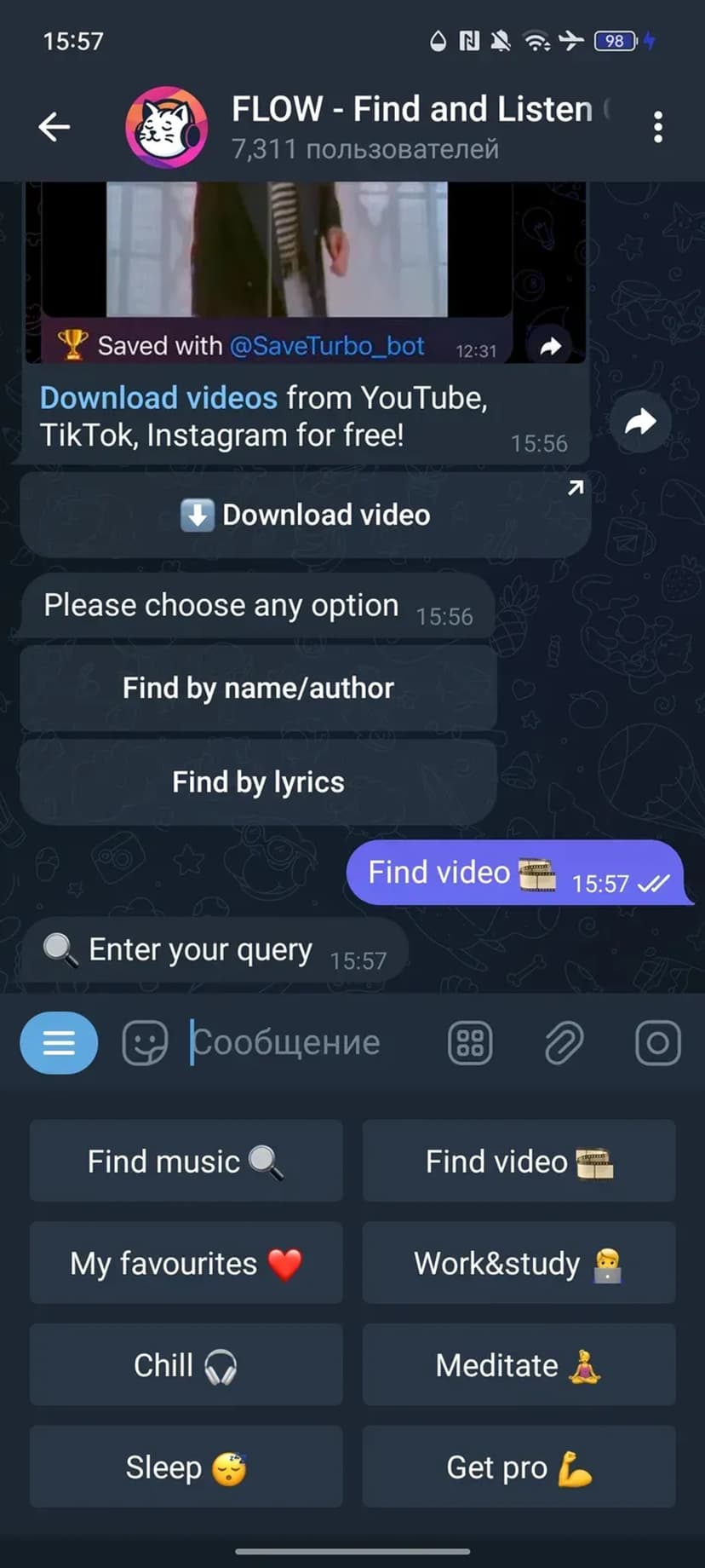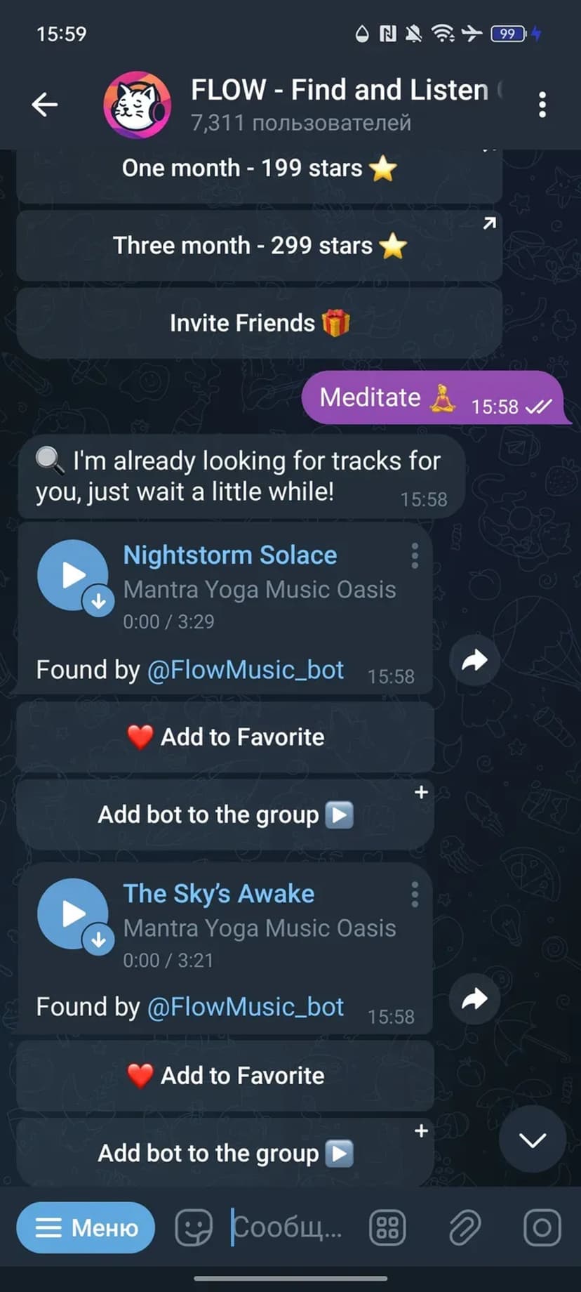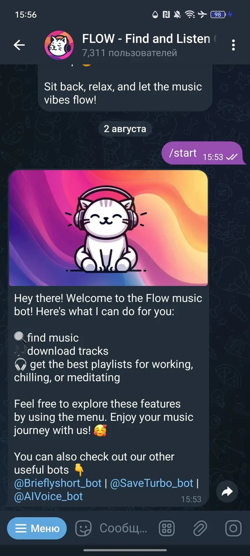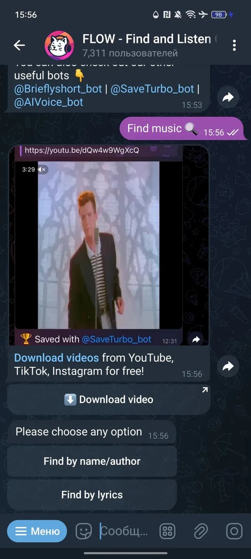 - Прослушивание прямо в чате и возможность сохранить трек на устройство.