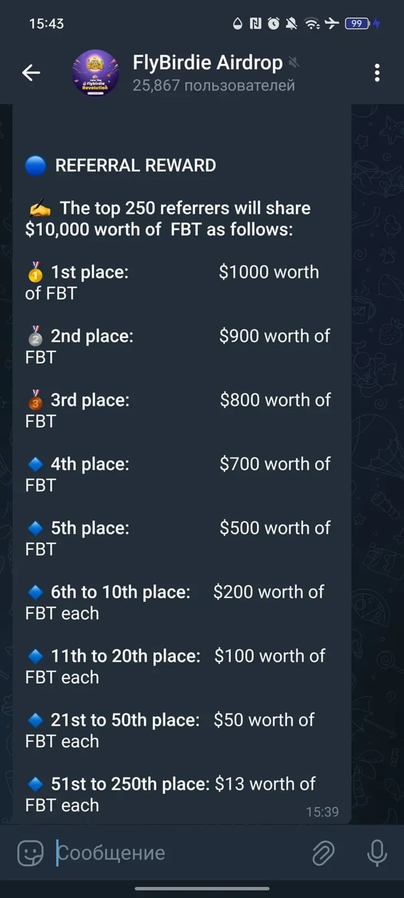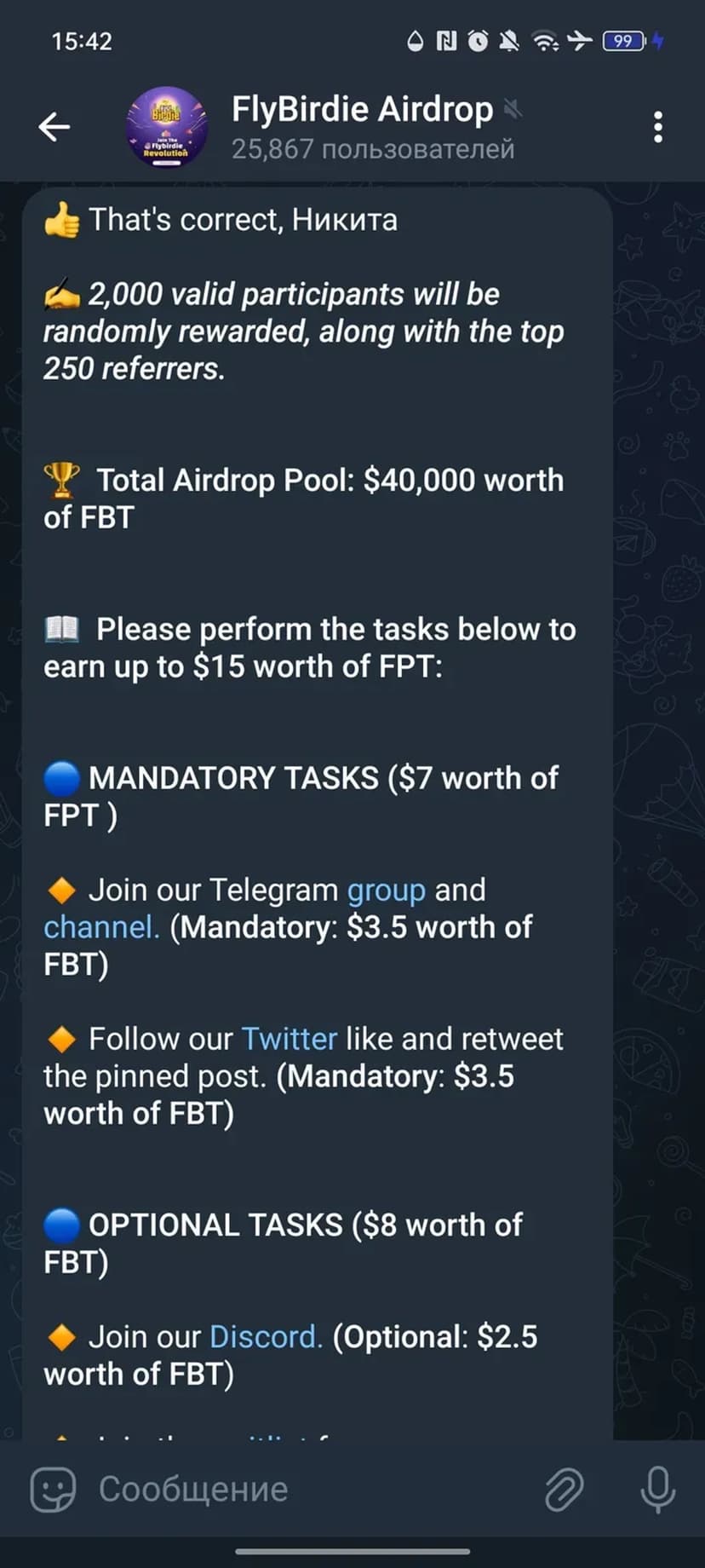 FlyBirdie Airdrop распределяет пул в $40,000 в токенах FBT между участниками акции. Участие проходит через бота — после регистрации пользователь автоматически попадает в розыгрыш.