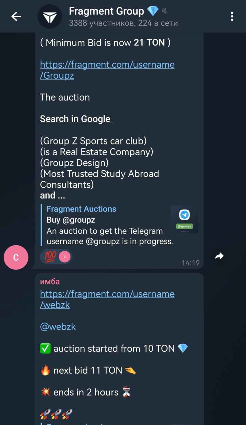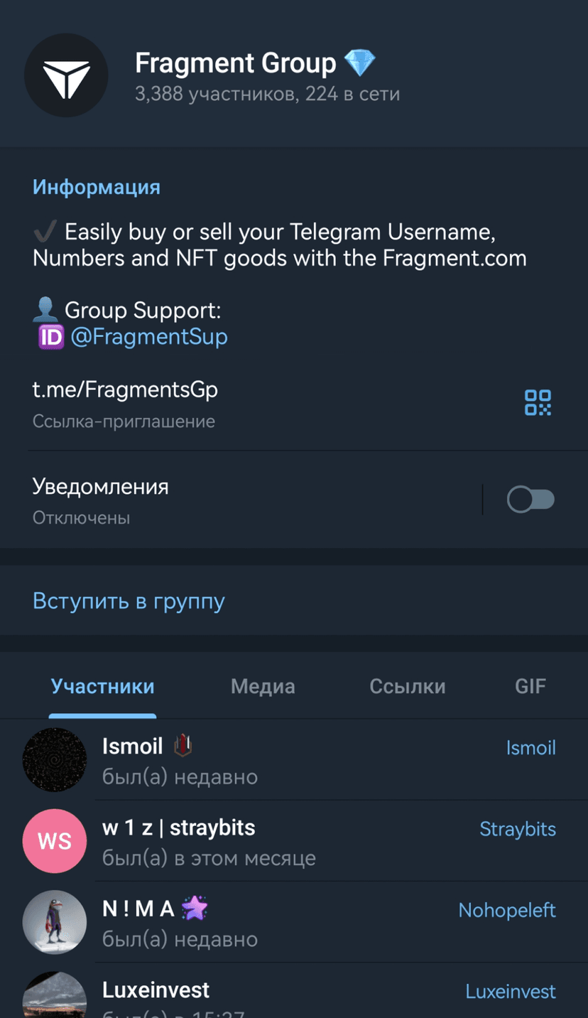 Fragment Group — сообщество в Telegram для организации сделок с Telegram-никнеймами, анонимными номерами, доменами и NFT, в том числе связанными с платформой fragment.com. Группа служит каналом для обмена предложениями и поиска контрагентов.