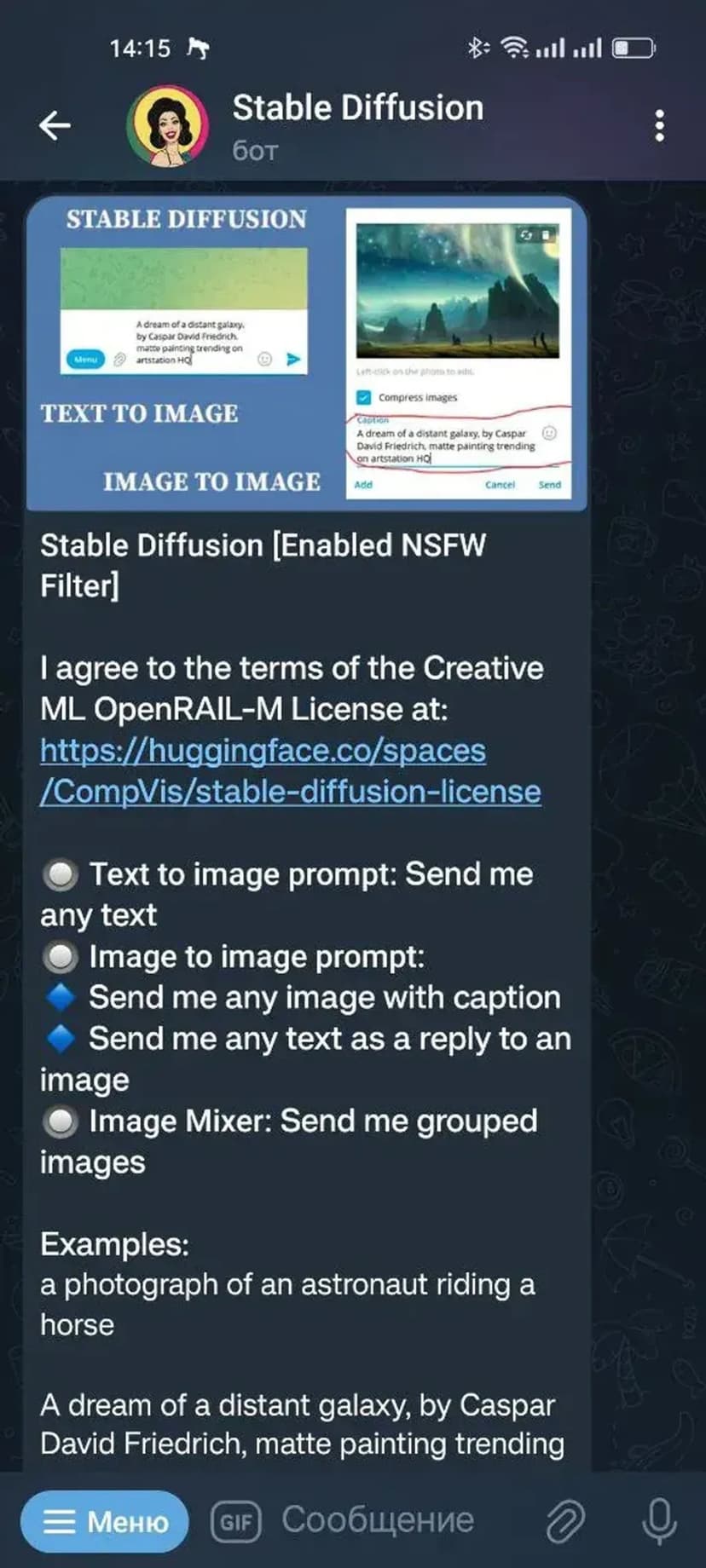 *Нажимая "Открыть в Telegram", вы перейдете к приложению Free image creator | StableDiffusion в мессенджере Telegram