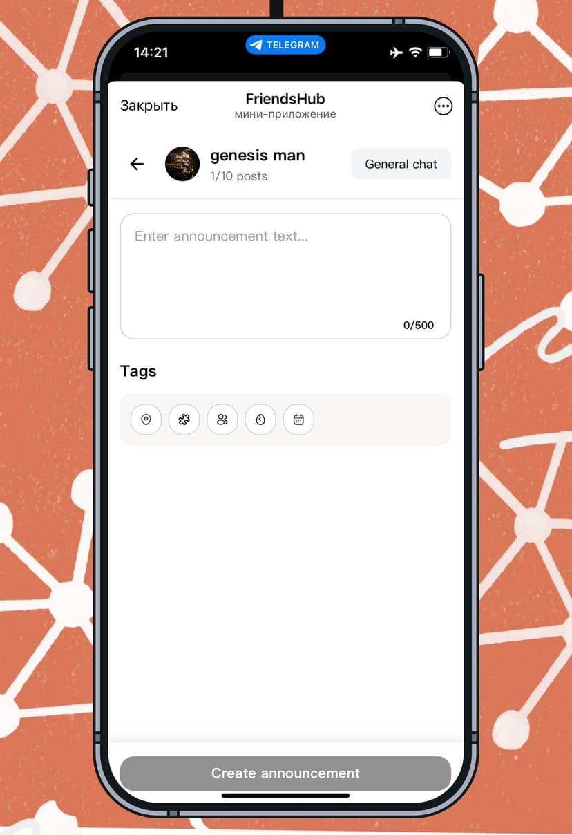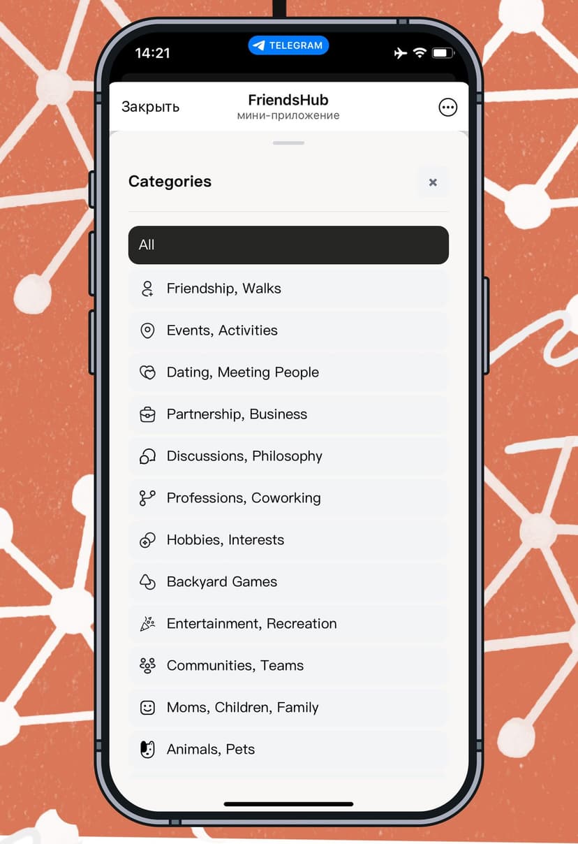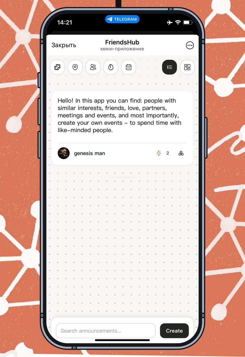 FriendsHub объединяет людей для знакомств, поиска друзей и организации встреч — всё внутри Telegram.