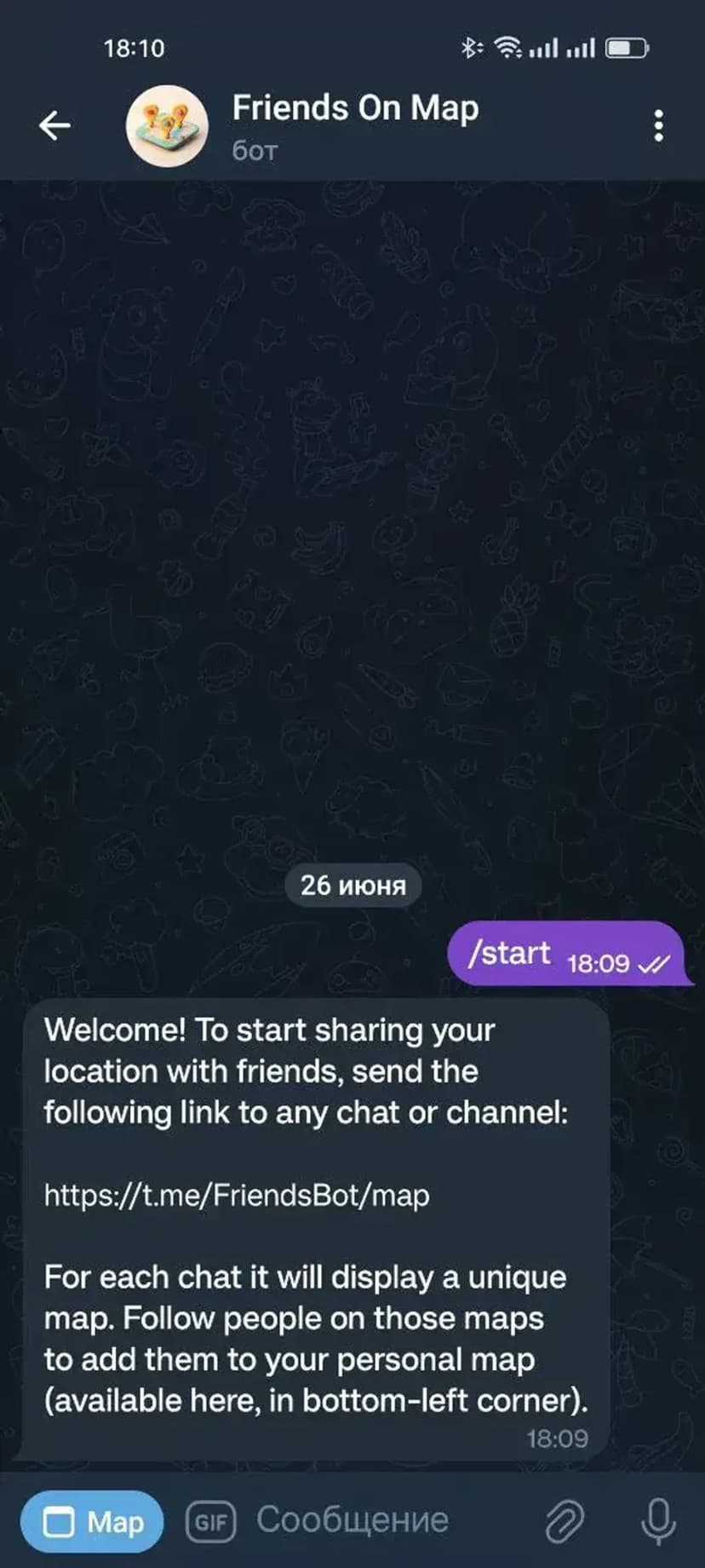 *Нажимая "Открыть в Telegram", вы перейдете к приложению Friends On Map в мессенджере Telegram