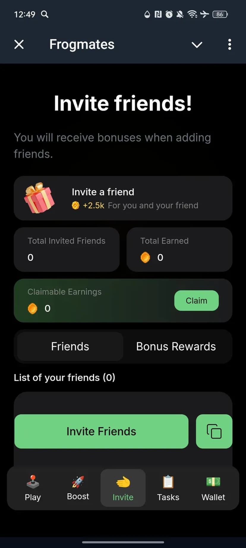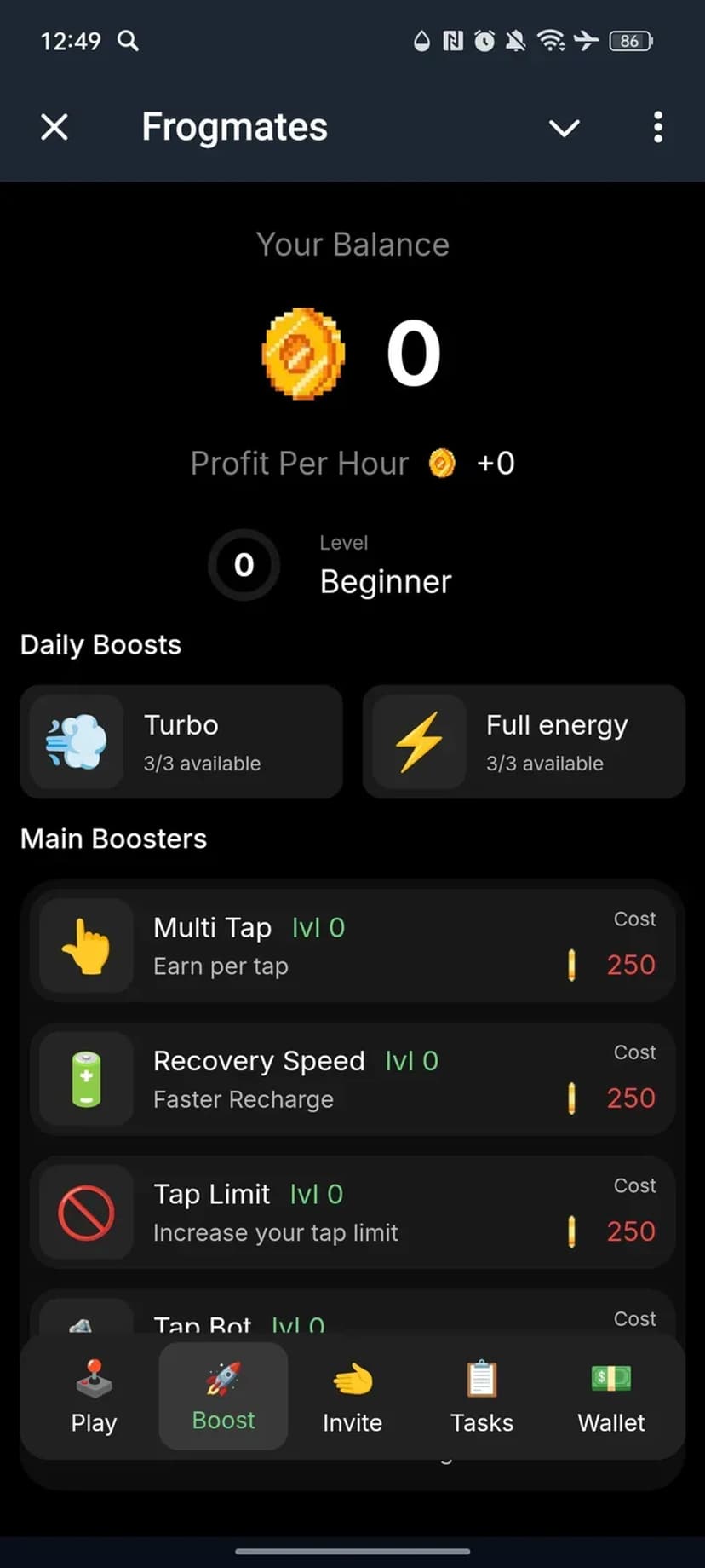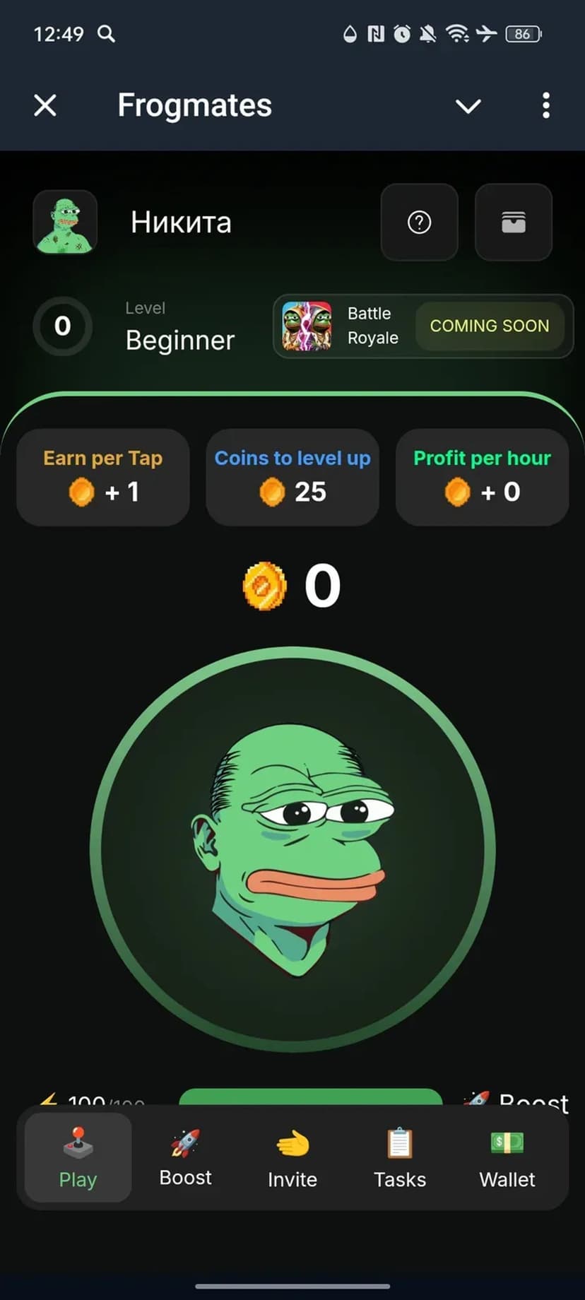 Тапай для начисления Frogmates Points, улучшай апгрейды, вступай в кланы и обменивай на токены.