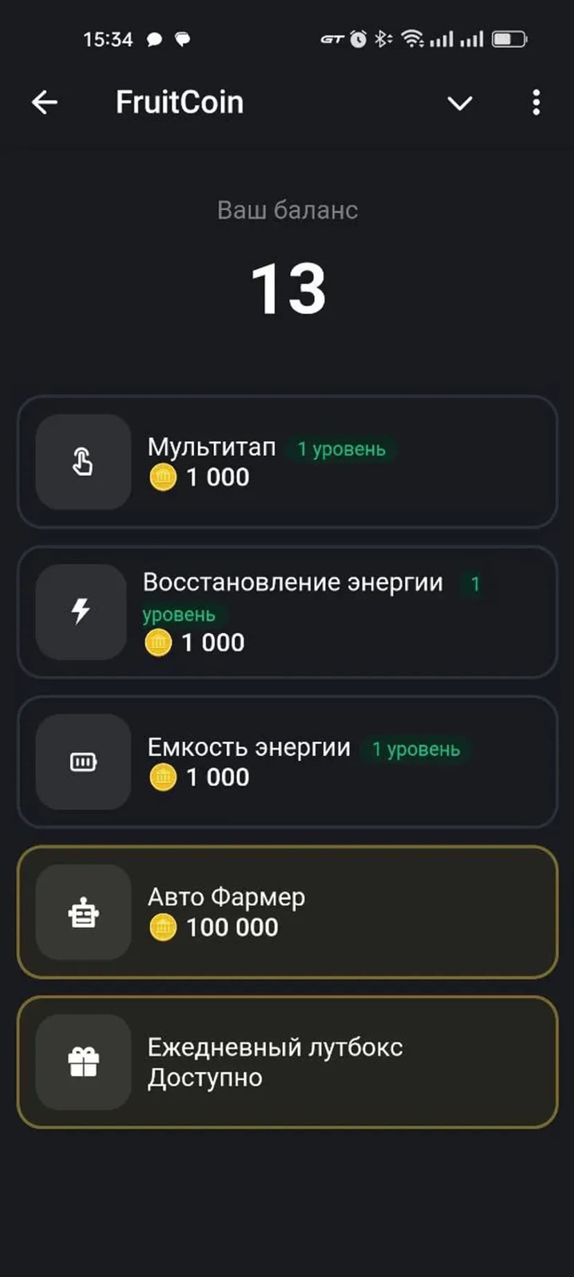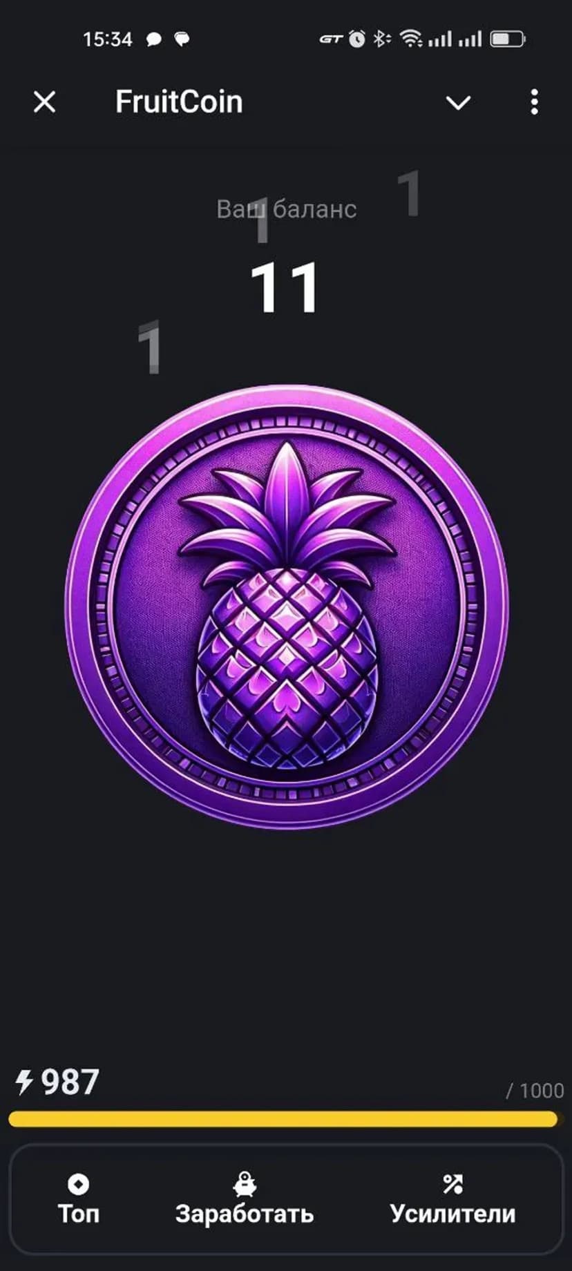 FruitCoin — простой и лаконичный кликер: нажимайте на большую монету, чтобы увеличивать виртуальный баланс и накапливать очки.