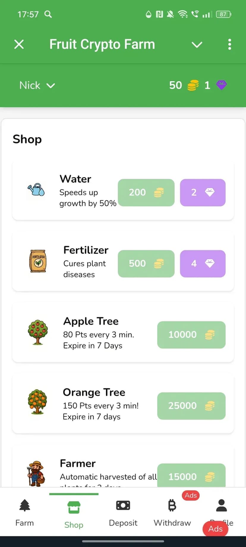 Fruit Crypto Farm — виртуальный фермерский бот в Telegram, где вы выращиваете цифровой сад, собираете урожай фруктов и получаете игровые награды в формате P2E. Проект сочетает простую геймификацию с элементами цифровой экономики и позволяет играть прямо в мессенджере.
