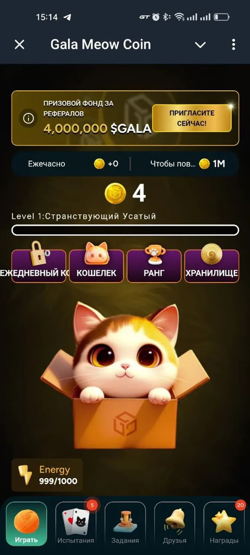 Кликер Gala Meow Coin — простая механика: зарабатывайте $TREZ кликами, $GALA за приглашения