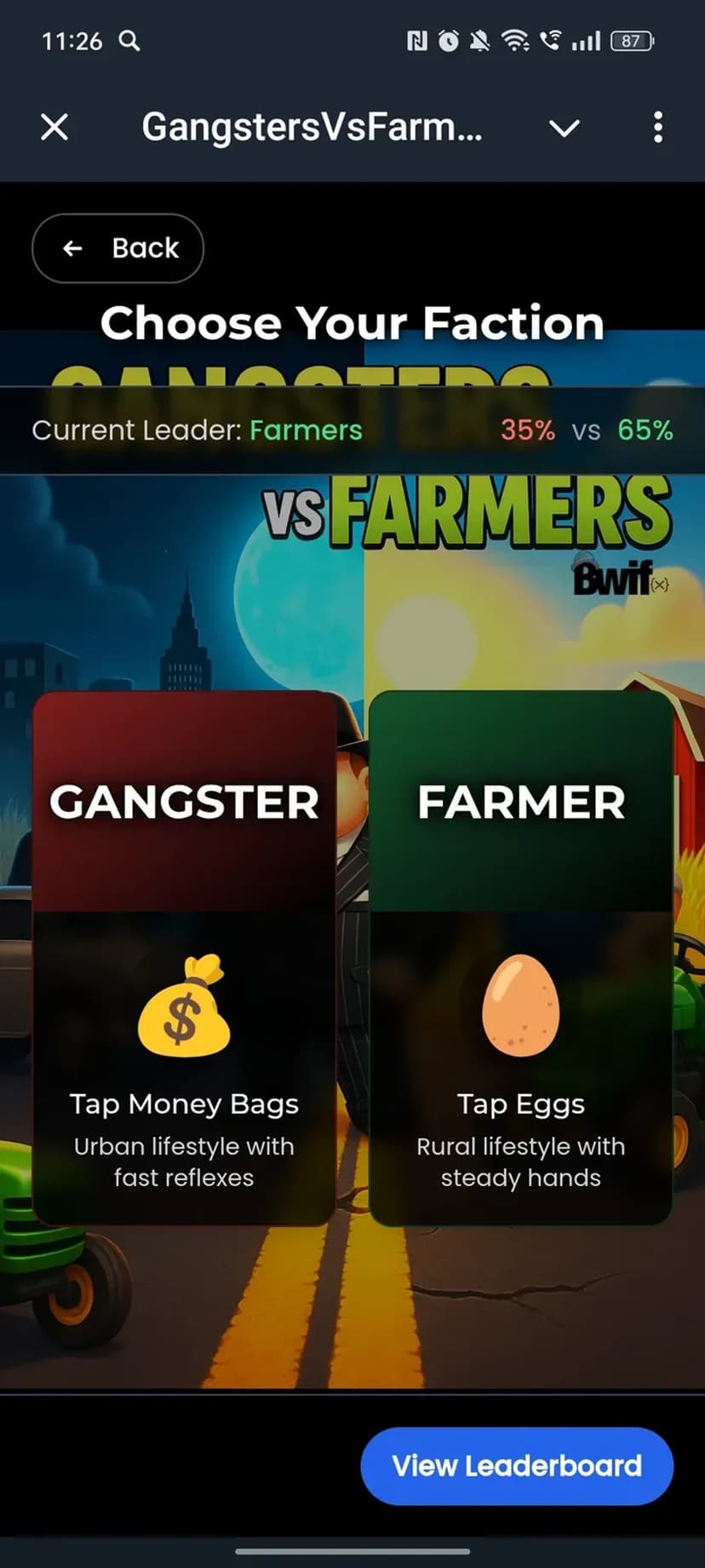 GangstersVsFarmers — соревновательная мини-игра, где игрок выбирает фракцию: гангстеры или фермеры, и нажатием на объекты получает очки для продвижения в рейтинге.