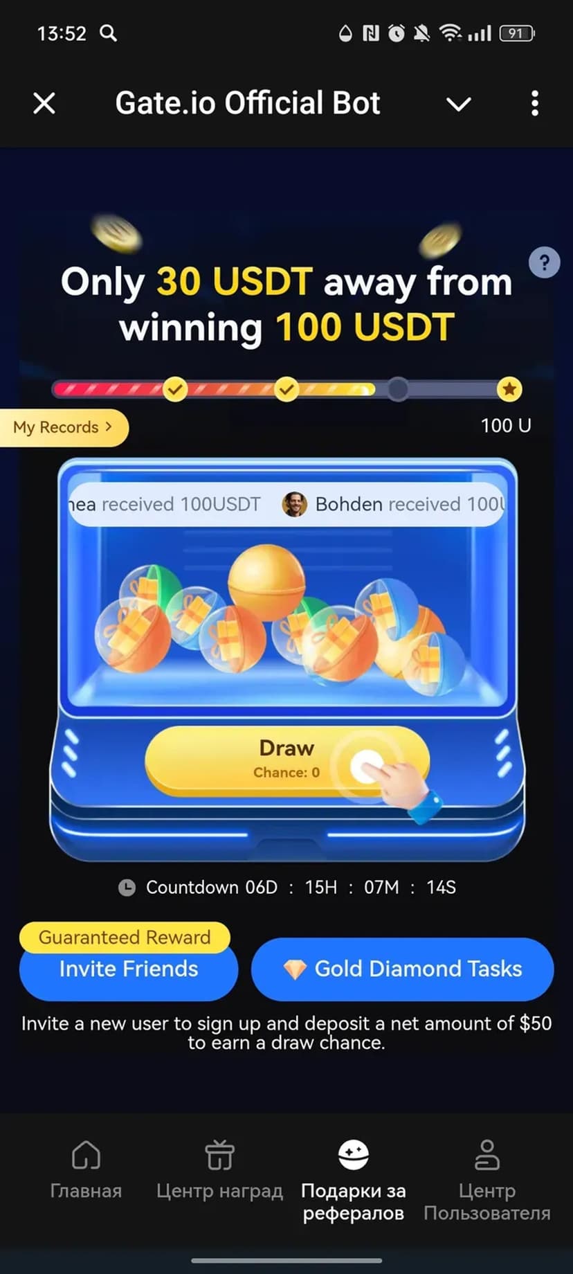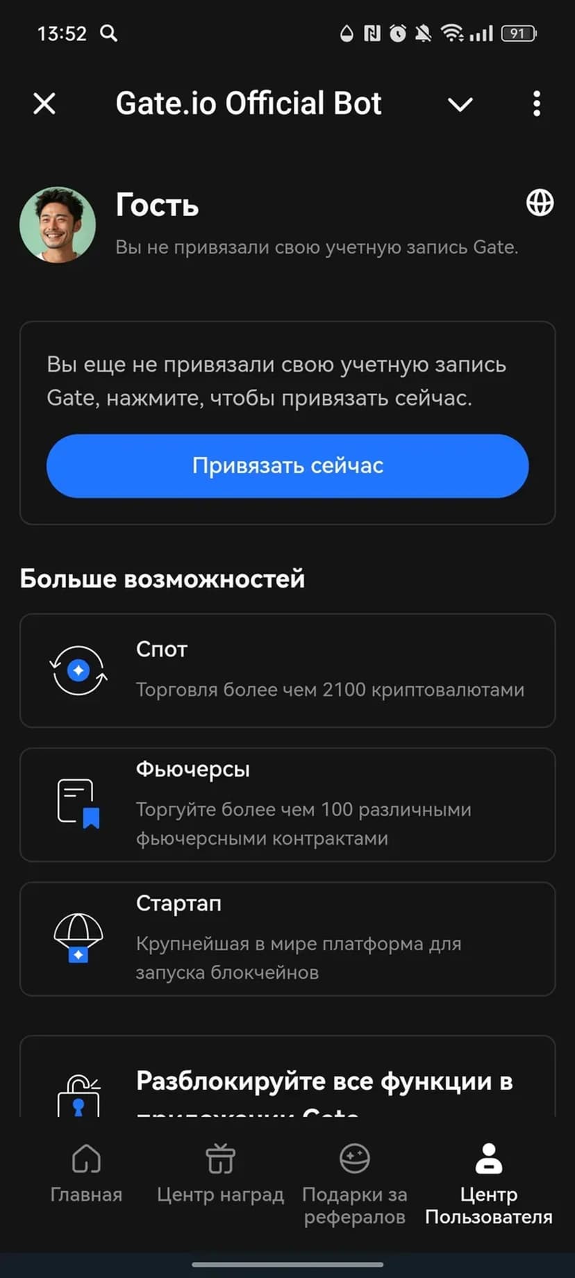 Официальный бот биржи Gate.io — регистрация, простые задания и бонусы до $100.