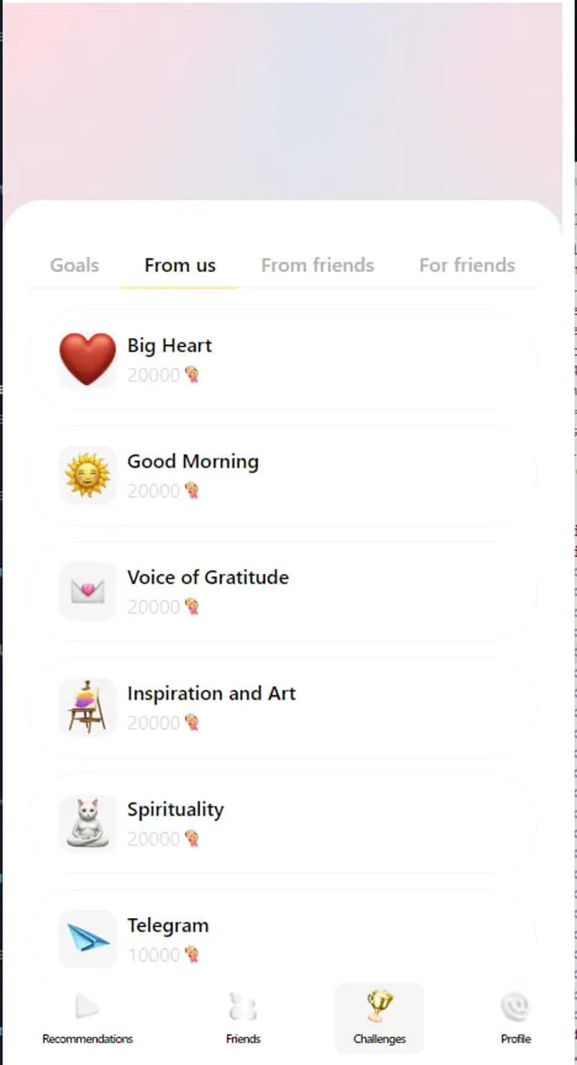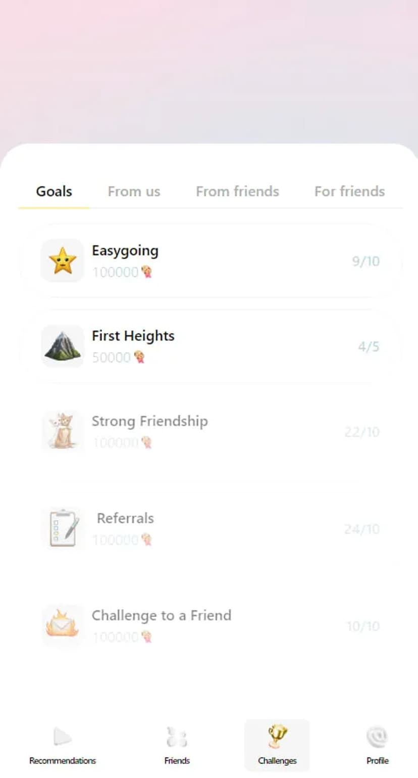 Каталог челленджей с персональными рекомендациями, рейтингом и возможностью бросать вызовы друзьям