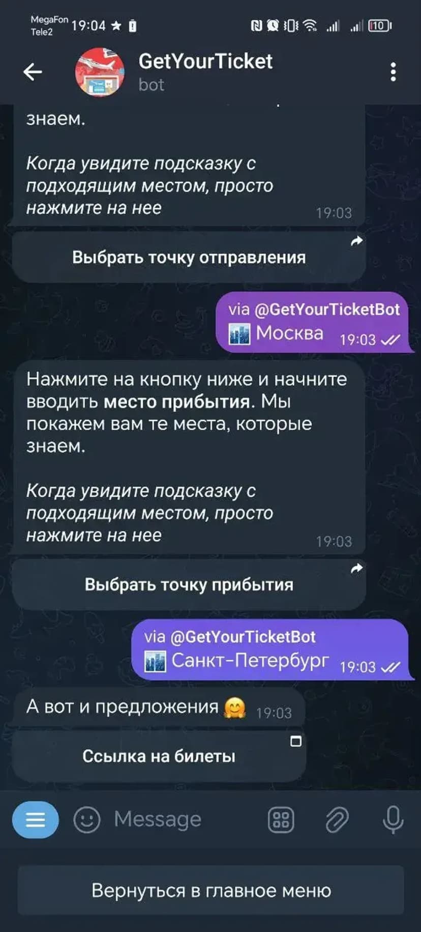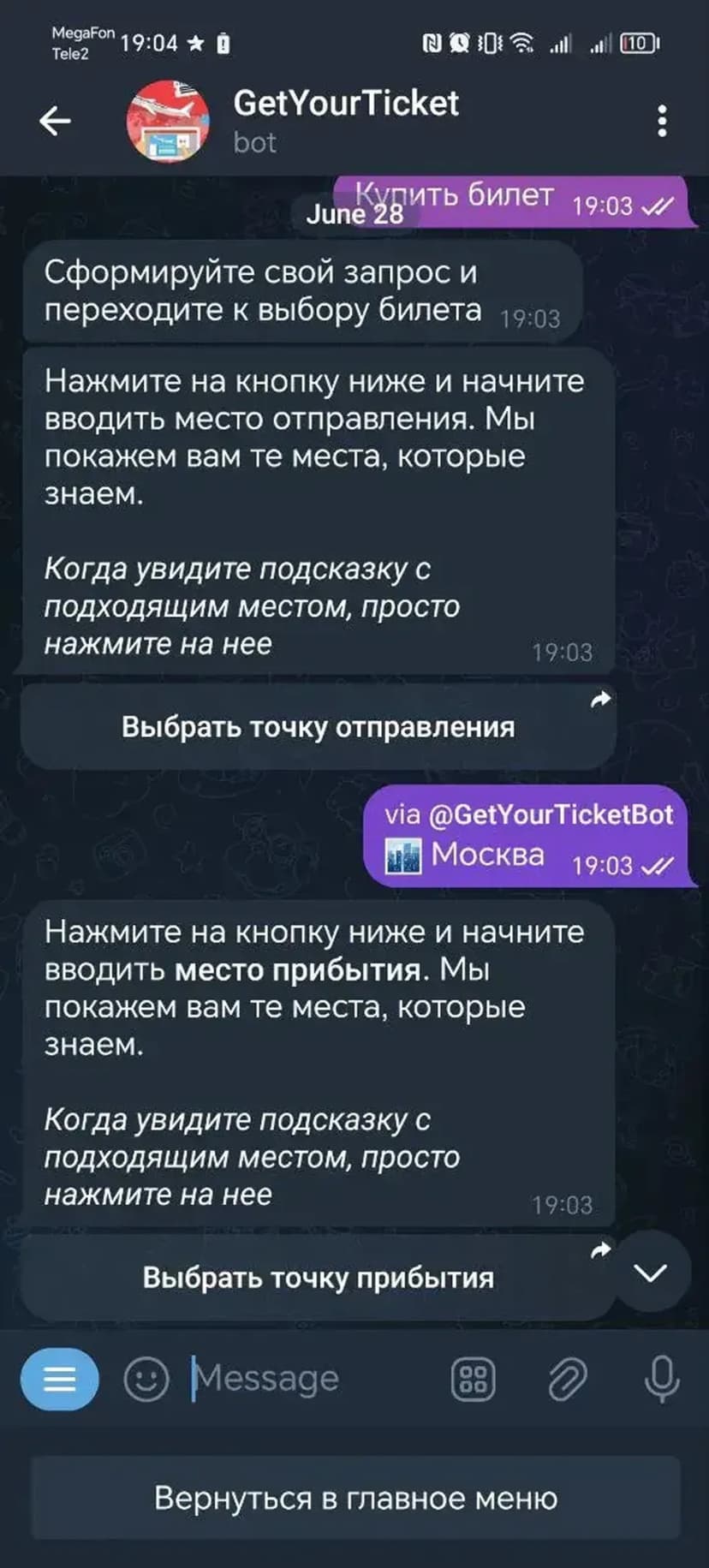 - Оплата и получение: оплата проходит в чате, электронный билет приходит в ответном сообщении.