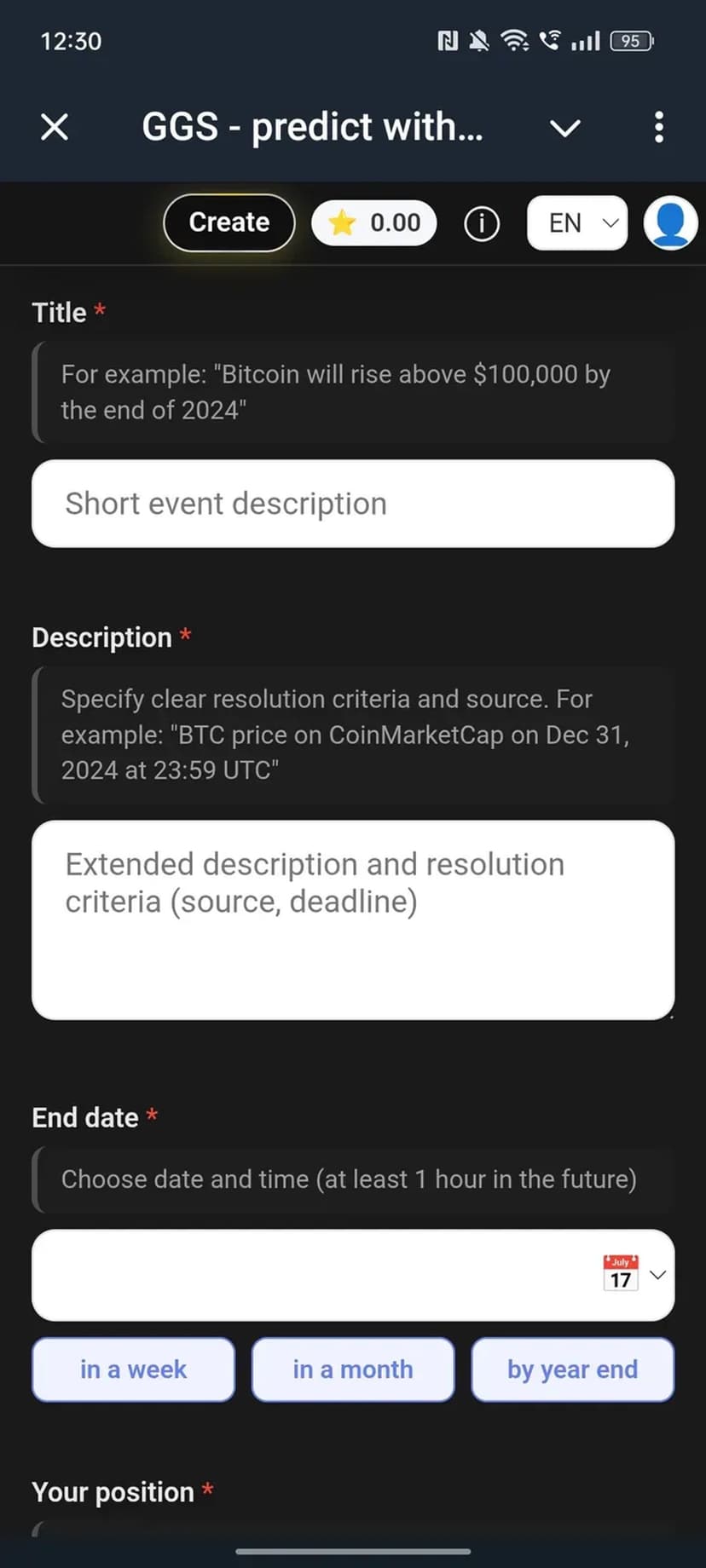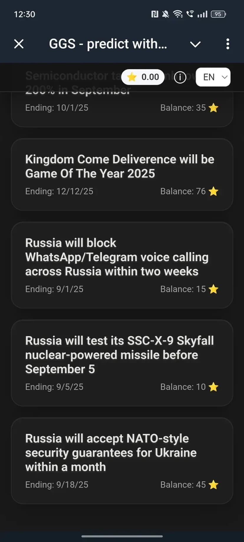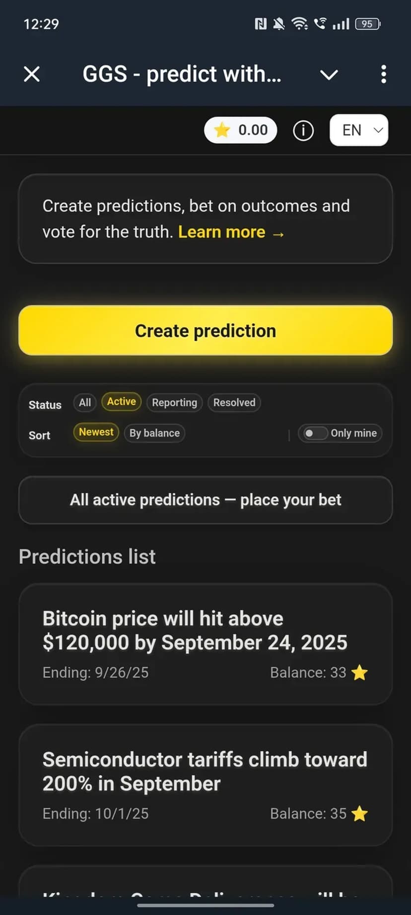 GGS Predictions with stars ⭐ — платформа для создания и участия в коллективных прогнозах. Пользователи формируют предсказания с возможными исходами, делают ставки на понравившийся вариант и после завершения события голосуют за фактический результат, чтобы определить распределение выплат.