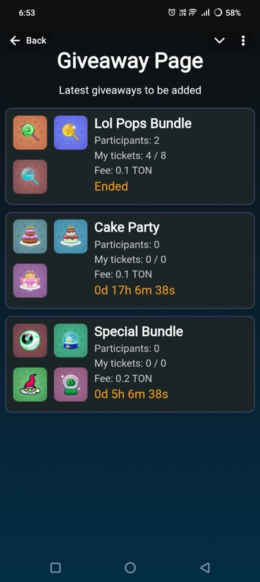 - Все выигрыши оформлены как NFT и доступны для хранения, продажи или обмена между пользователями.