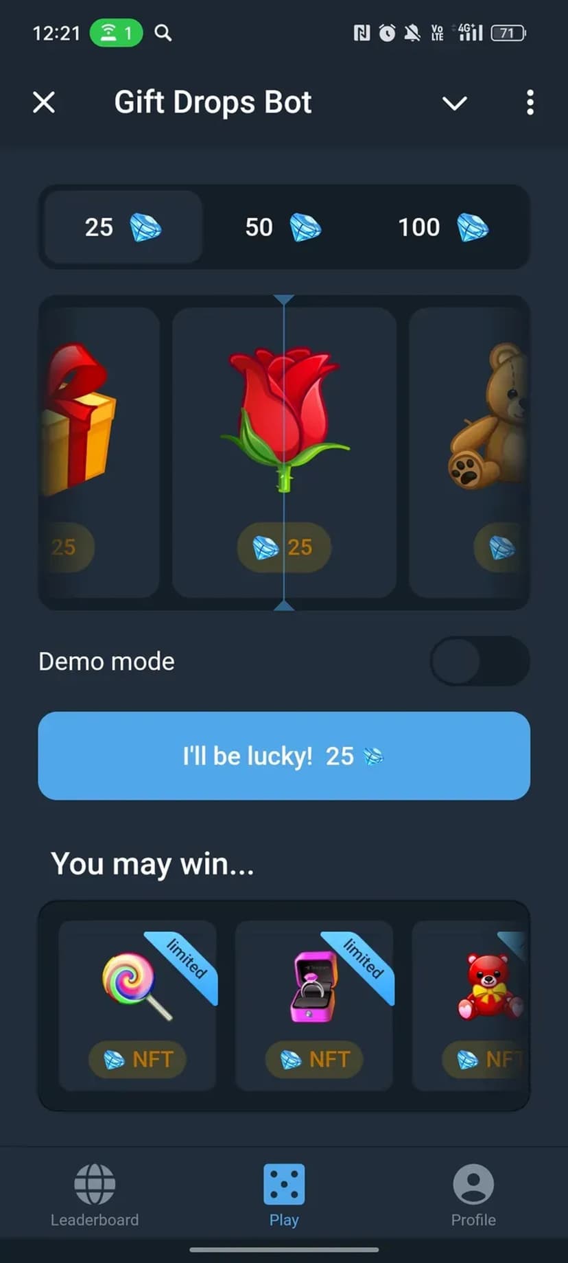 Gift Drops Bot — мини‑приложение в Telegram с механикой вращающегося барабана, где каждое вращение гарантированно приносит приз. Пользователи собирают подарки и редкие награды, пополняя личную коллекцию и поднимаясь в общем рейтинге.