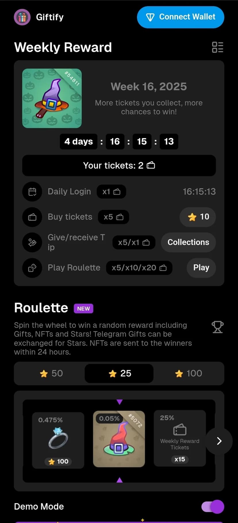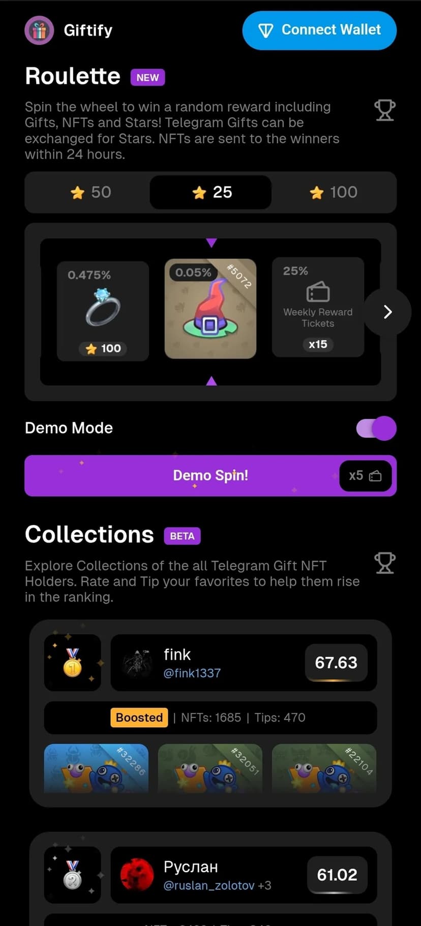- Розыгрыши и рулетка: участие в честных розыгрышах и рулетке с призами — Telegram Gifts, звёзды и NFT.
