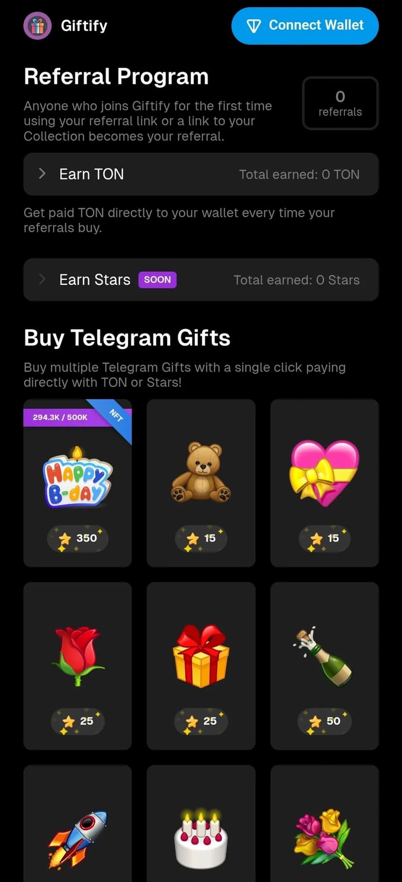 Giftify — бот для коллекционеров и энтузиастов Telegram Gifts и NFT, помогающий не пропускать ограниченные релизы и получать вознаграждения за активность.