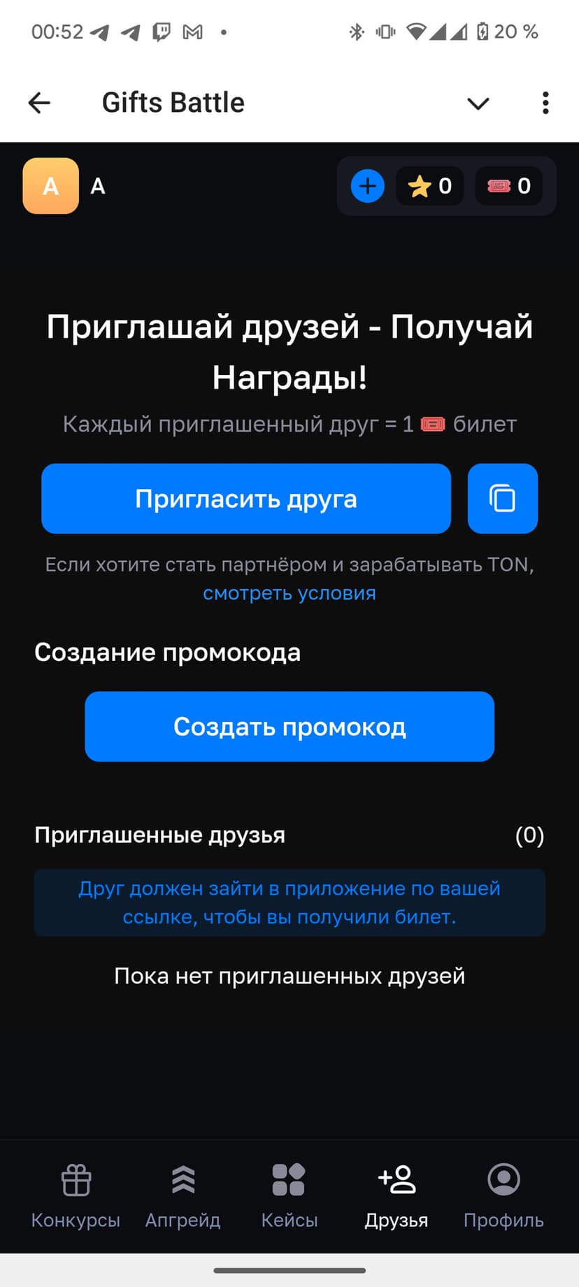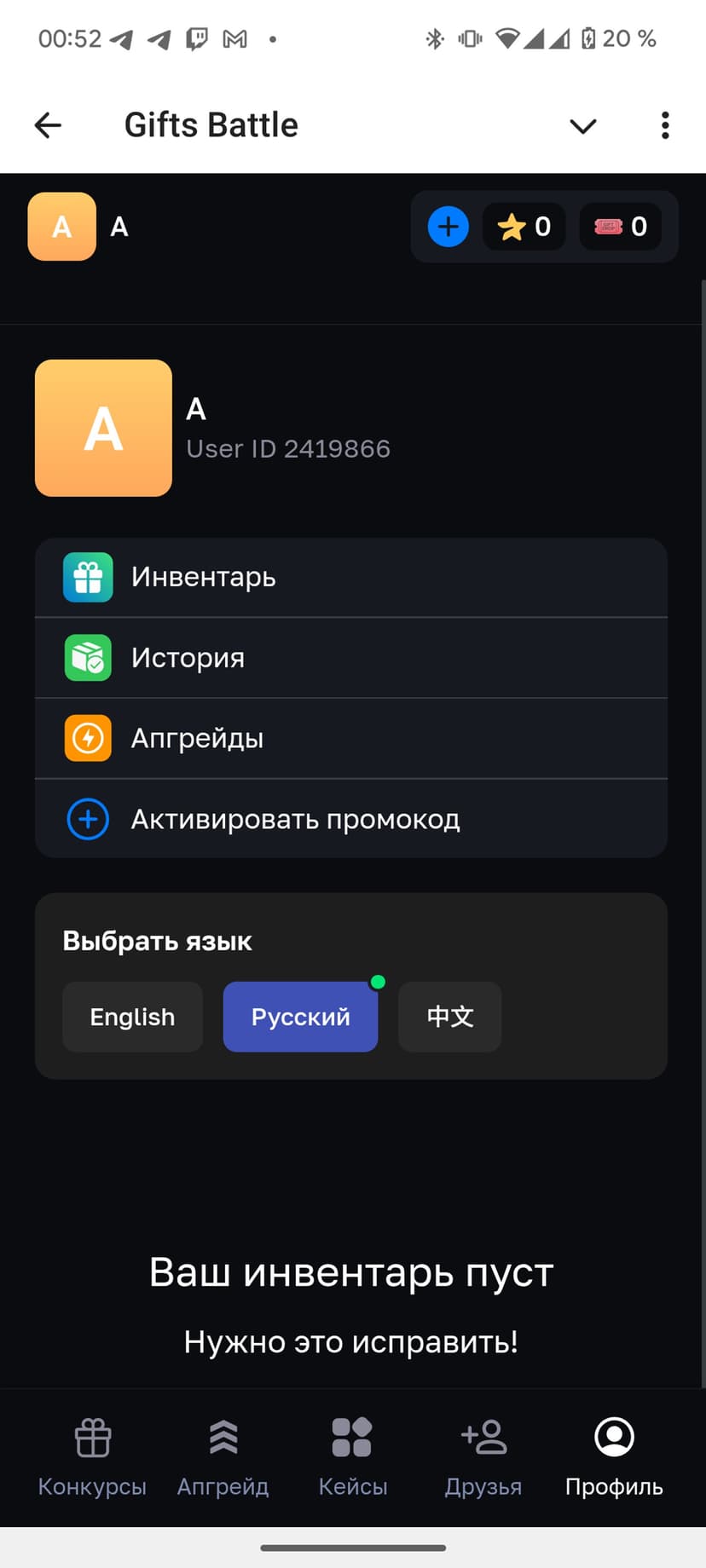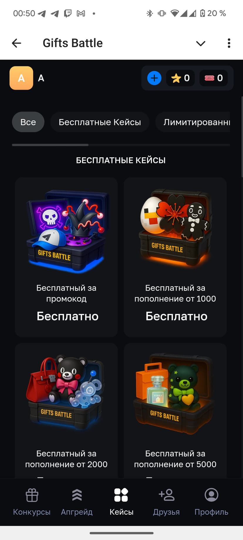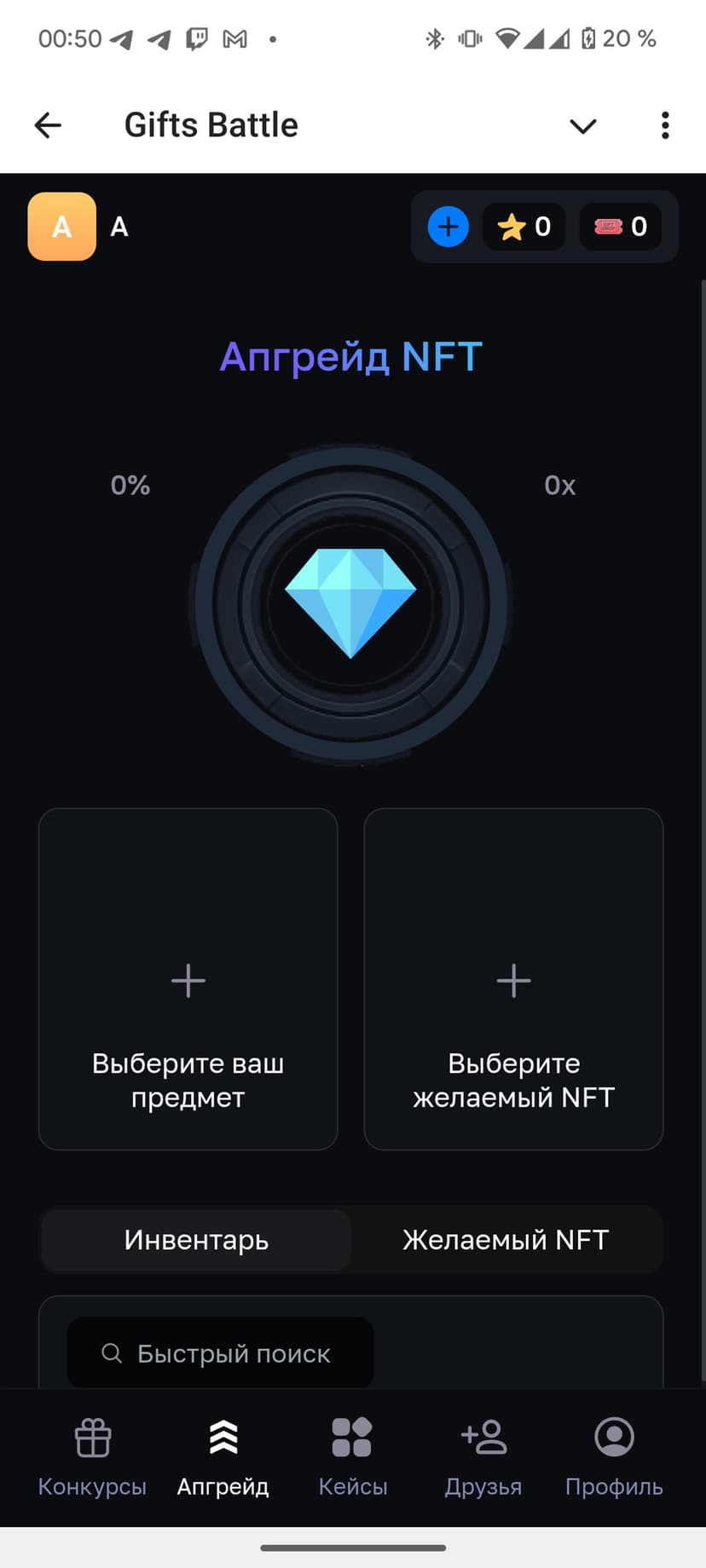 Gifts Battle позволяет открывать кейсы с Telegram‑подарками и NFT, участвовать в конкурсах, активировать промокоды и получать призы прямо на аккаунт.