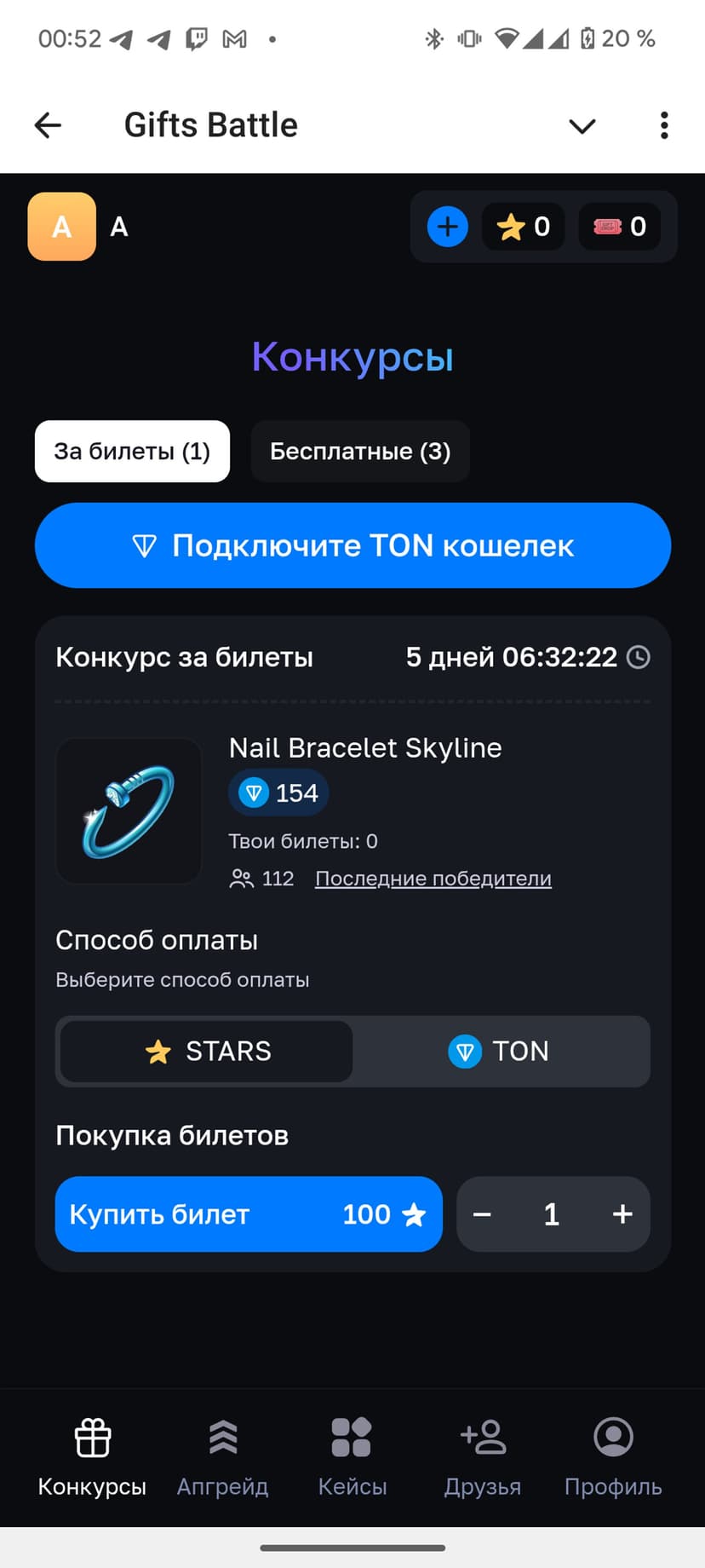 Открывайте кейсы с Telegram‑подарками и NFT, участвуйте в конкурсах и выводите призы мгновенно