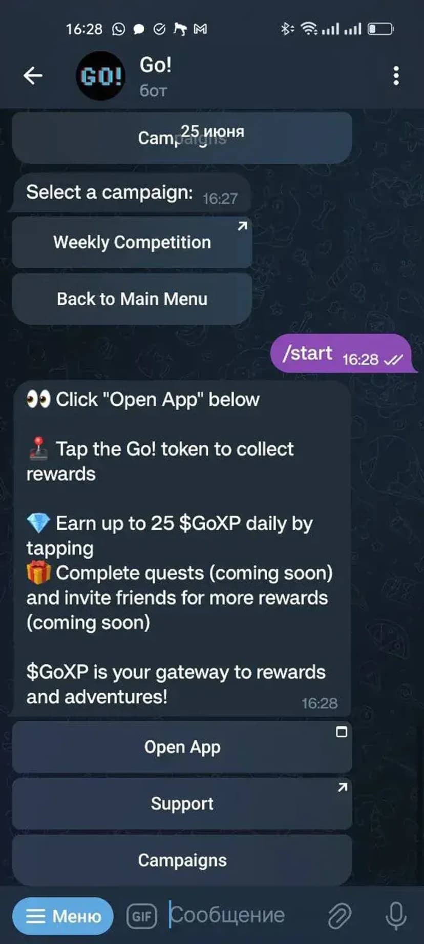 Go! ориентирован на быстрые игровые взаимодействия с возможностью получения внутриигровых вознаграждений. Нажимая на токен Go!, пользователь собирает $GoXP — специальную игровую валюту.