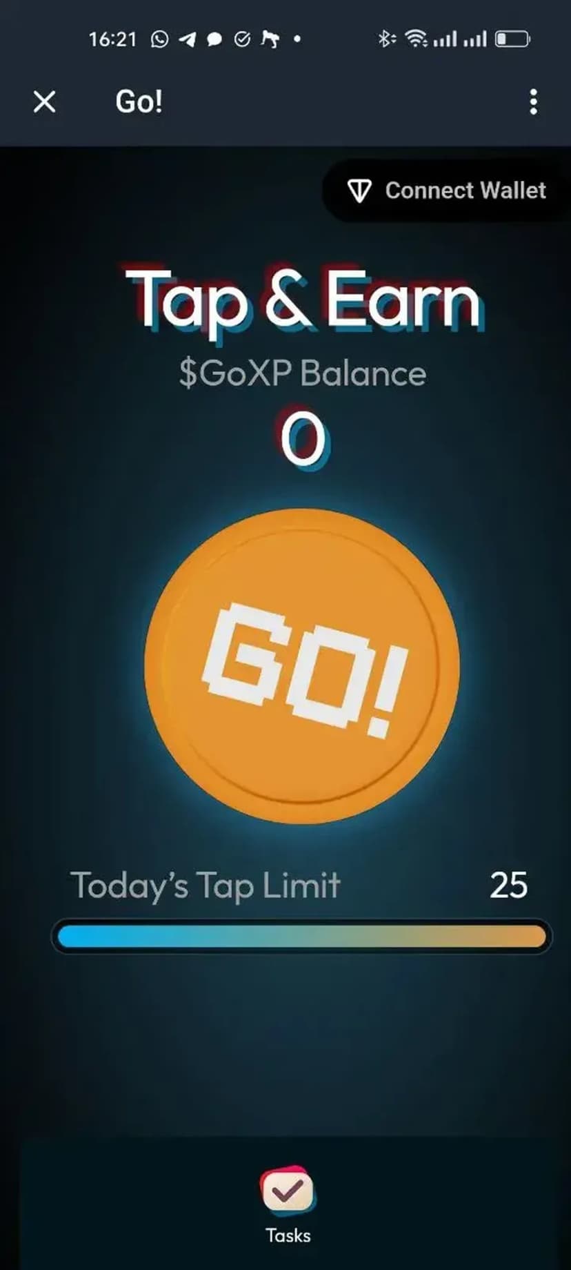 Тапайте токен Go! и собирайте до 25 $GoXP в день — быстрые игровые награды.