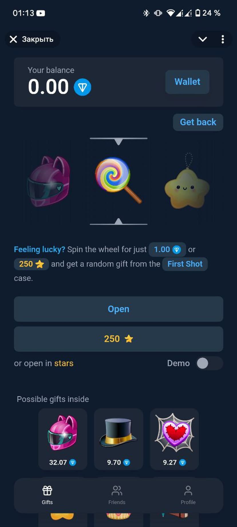 GoGift позволяет открывать кейсы с виртуальными подарками, включая NFT: в коробках попадаются как обычные, так и редкие дорогие призы, иногда стоящие дороже самого кейса. Система работает по принципу случайной лотереи.