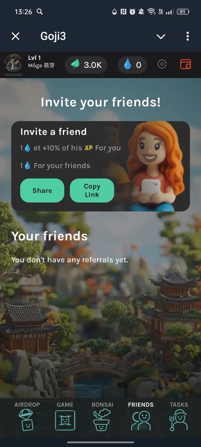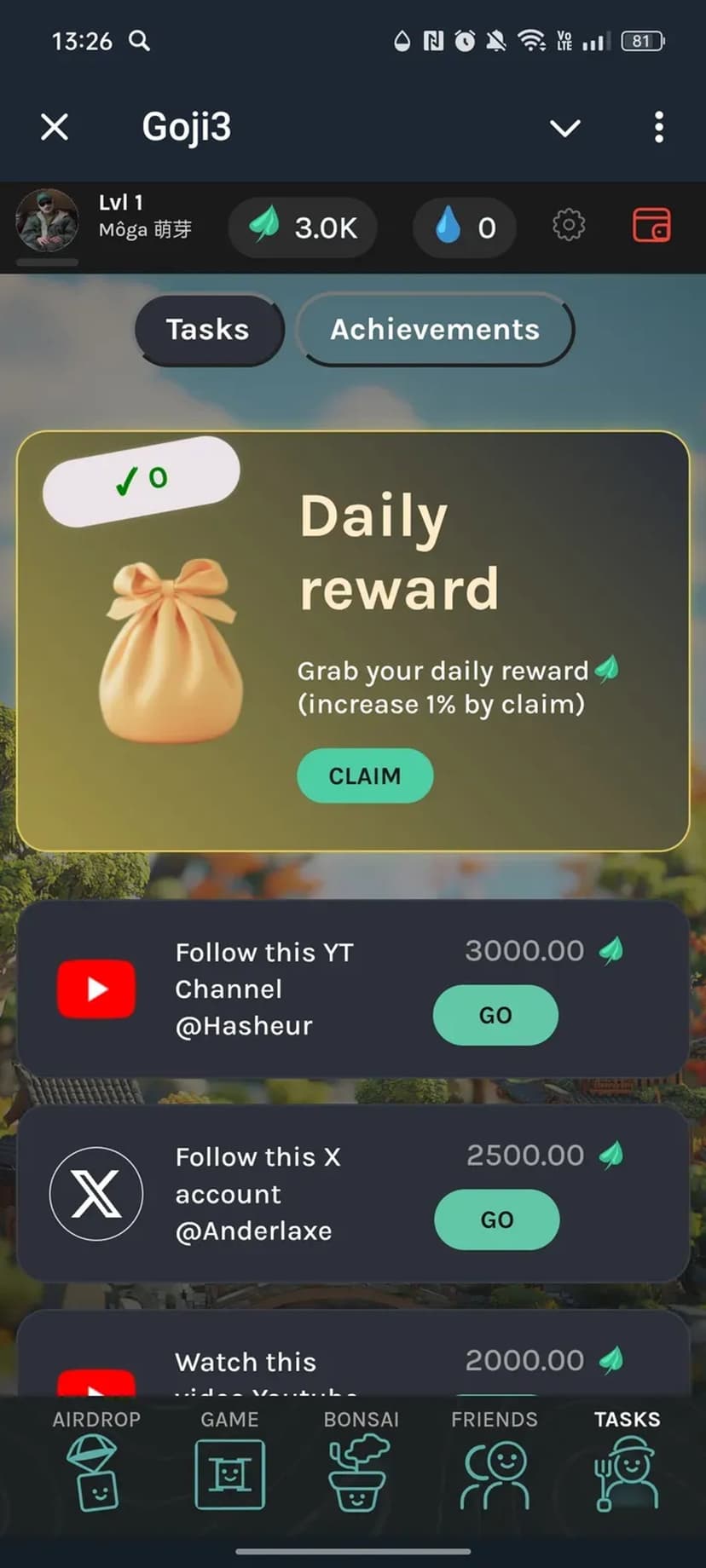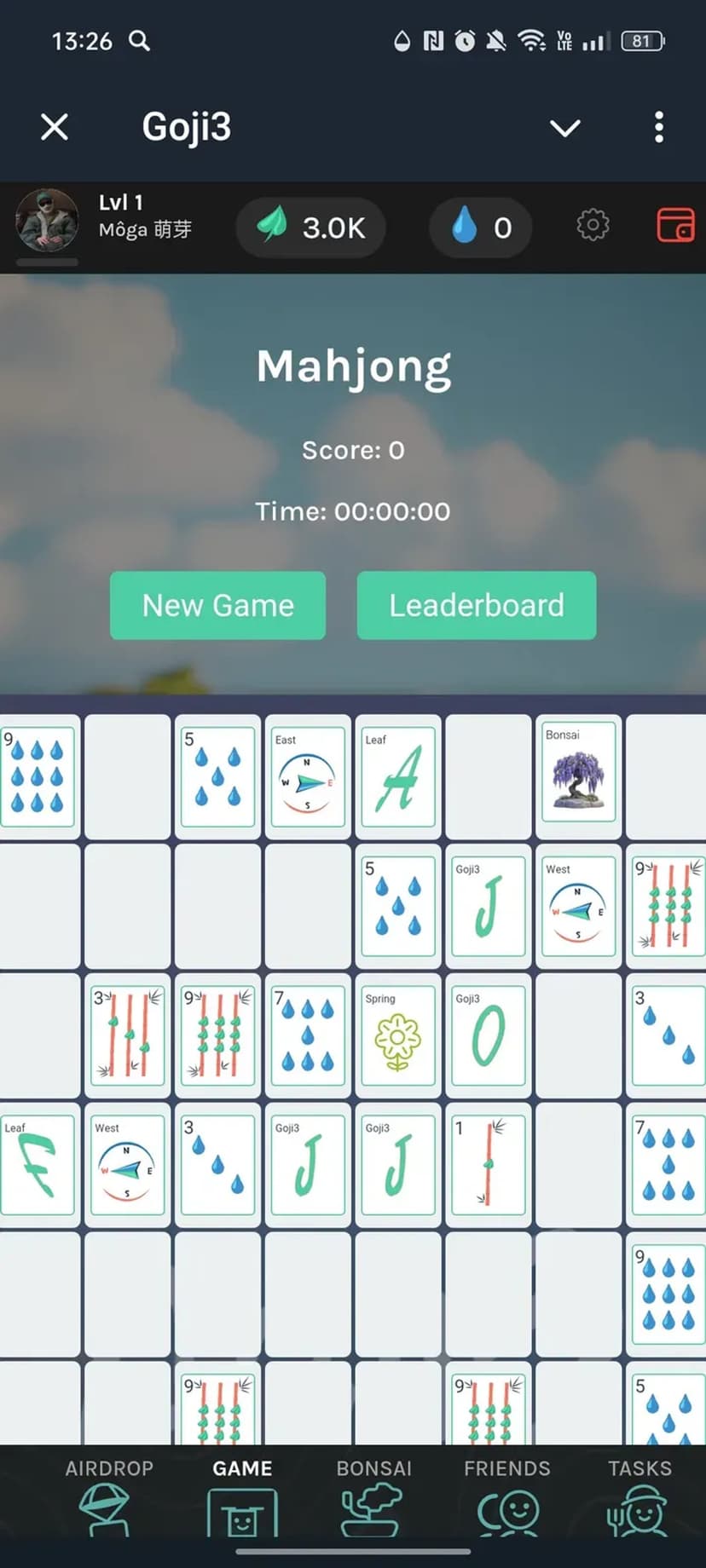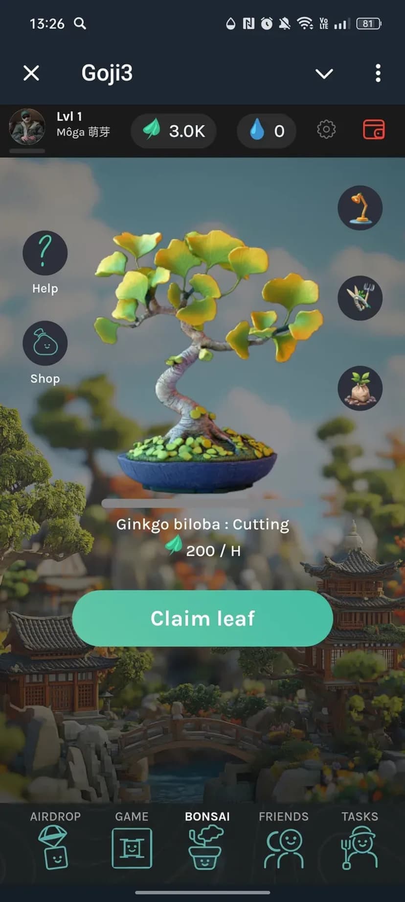Goji3 — игра в Telegram, где пользователи выращивают виртуальные деревья бонсай, ежедневно собирают внутриигровую валюту $LEAF и получают награды за выполнение квестов и апгрейды.