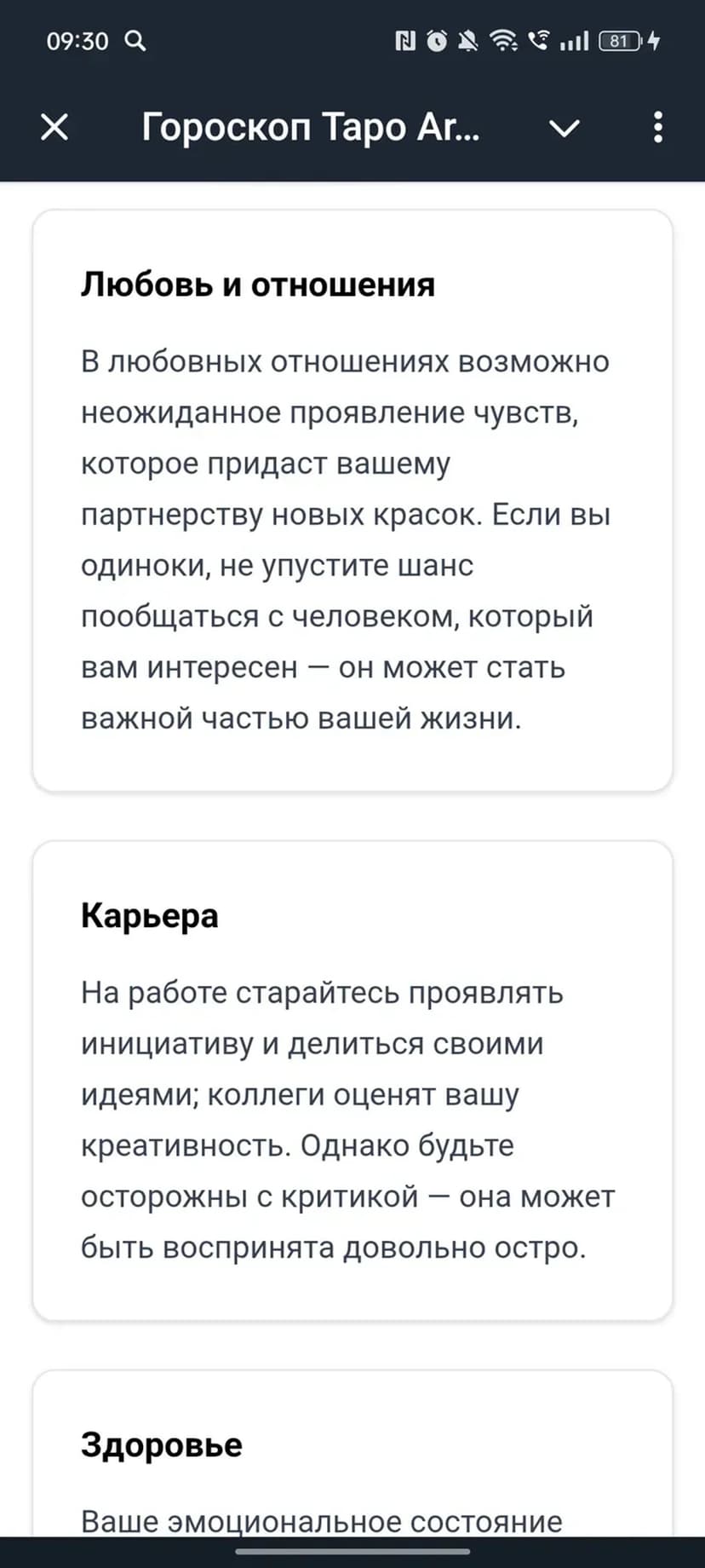 - Выбор раздела: общий гороскоп, предсказание на день или консультация по конкретному вопросу.