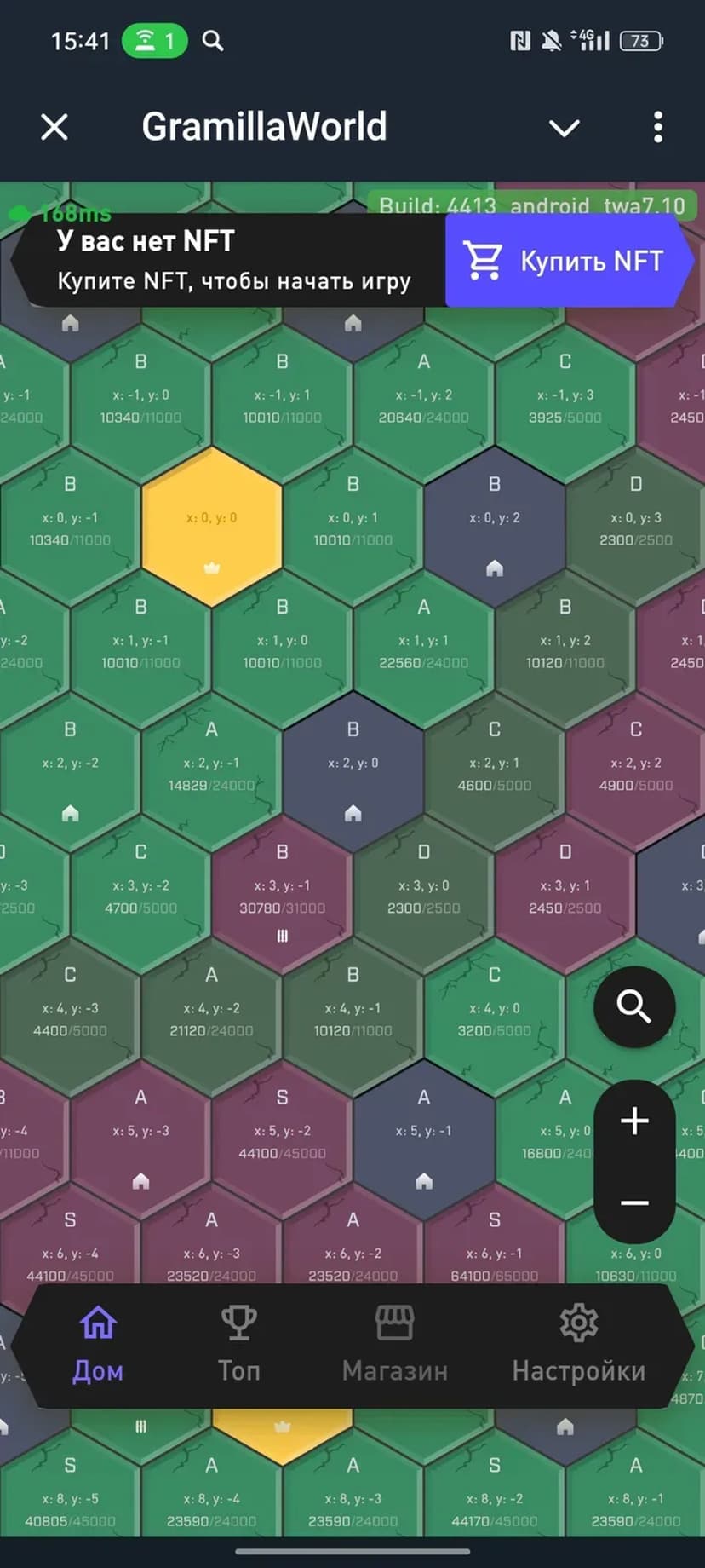 На карте выделены сектора, которыми управляют игроки. Через главное меню выполняются основные действия: захват новых участков, укрепление обороны и взаимодействие с соперниками. В приложении отображается текущий баланс GRAM, занятые территории и позиция в общем рейтинге.