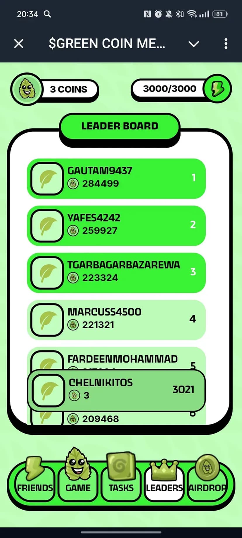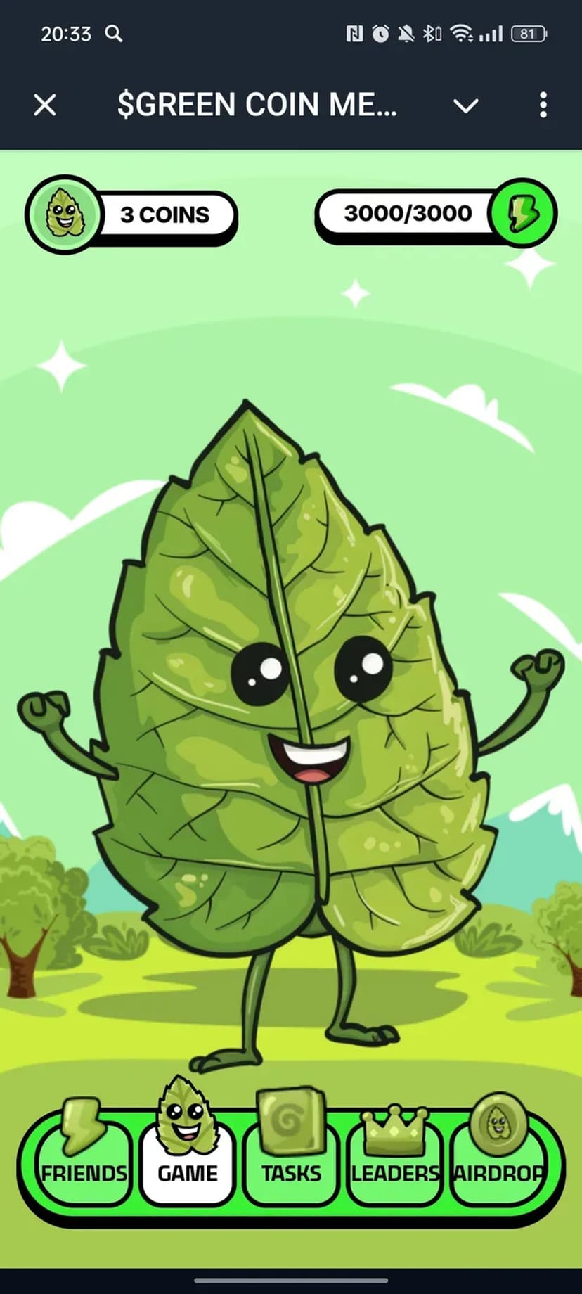 $GREEN COIN MEME | SOL — мини‑приложение в Telegram для любителей криптовалют и мем‑коинов. Игровая механика основана на простом нажатии: пользователи собирают внутриигровые аирдроп‑коины и получают бонусы за активность.