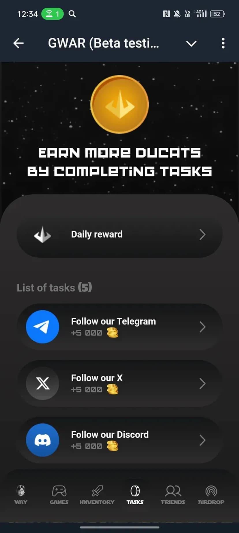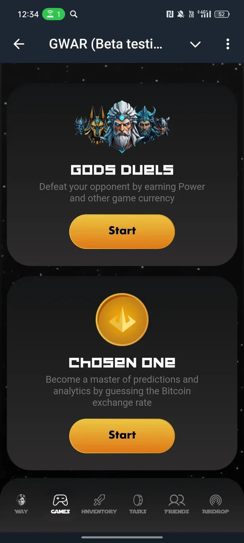 GWAR (Beta testing) — космическая PVP-мини-игра с элементами исследования и коллекционирования. Игроки участвуют в сражениях, развивают персонажа, зарабатывают внутриигровую валюту — дукаты — и собирают коллекции древних богов ради главного приза.