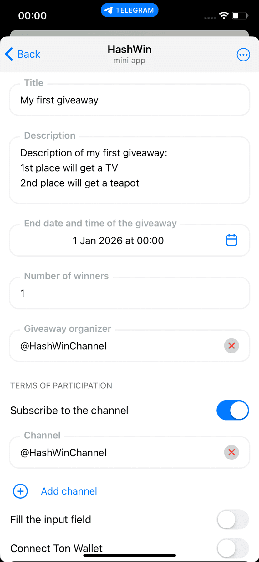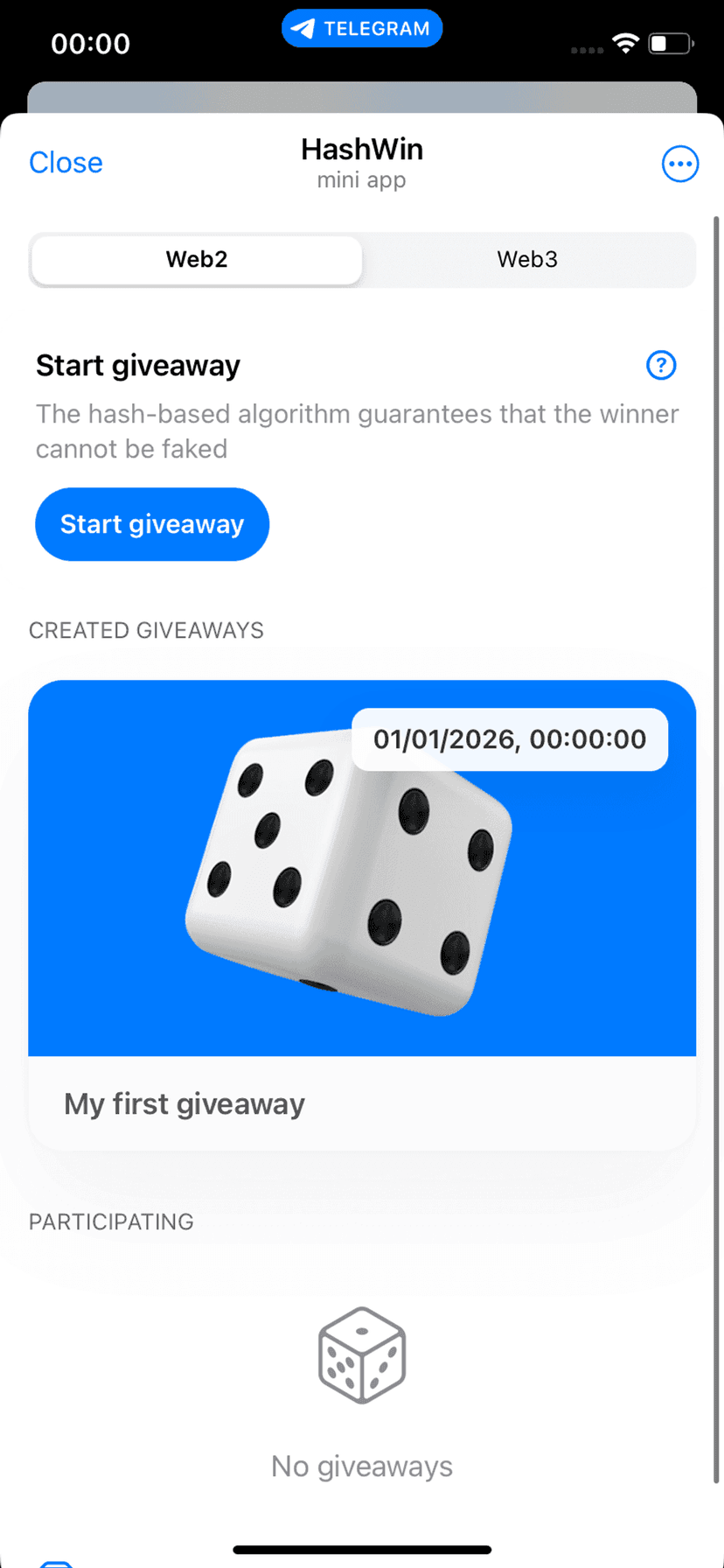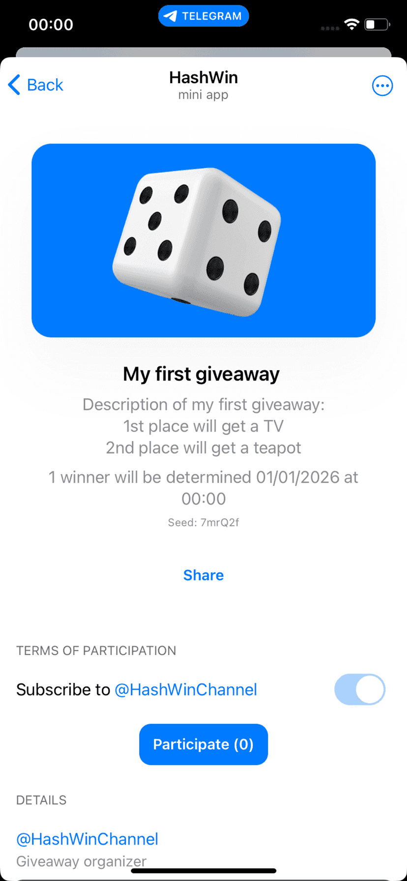 HashWin проводит прозрачные розыгрыши в Telegram с использованием хеш‑алгоритма, который делает результаты защитимыми от подделки. Пользователь получает понятный интерфейс: стартовую страницу с кнопкой запуска и полями для названия, описания и условий участия.