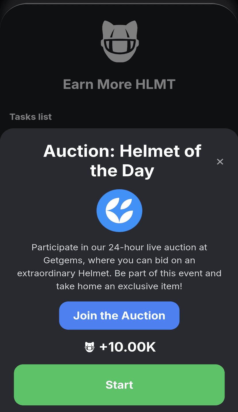 - Раздел «Коллекция шлемов» для управления NFT‑предметами, открывающими доступ к будущему airdrop HLMT‑токена.