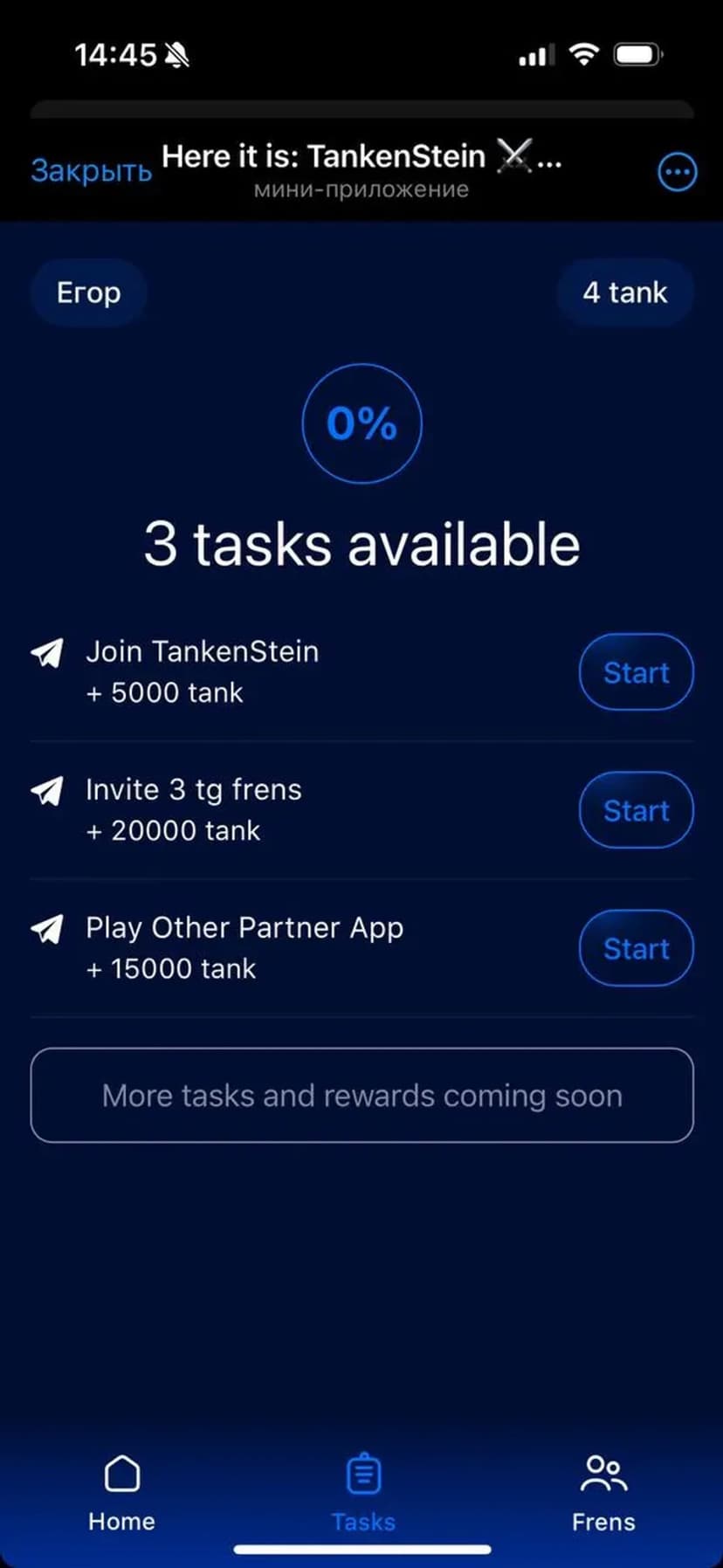 *Нажимая "Открыть в Telegram", вы перейдете к приложению Here it is: TankenStein ⚔️ Click to Earn! в мессенджере Telegram