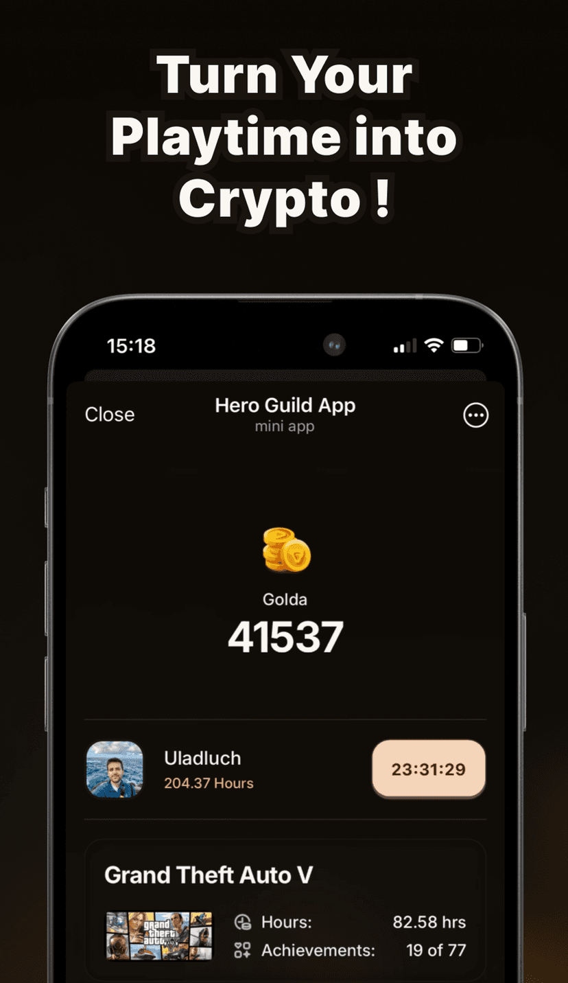 Hero Guild позволяет монетизировать игровое время в Steam: подключите свой Steam‑аккаунт и получайте GOLDA — внутриигровые токены — за активность и выполнение квестов.
