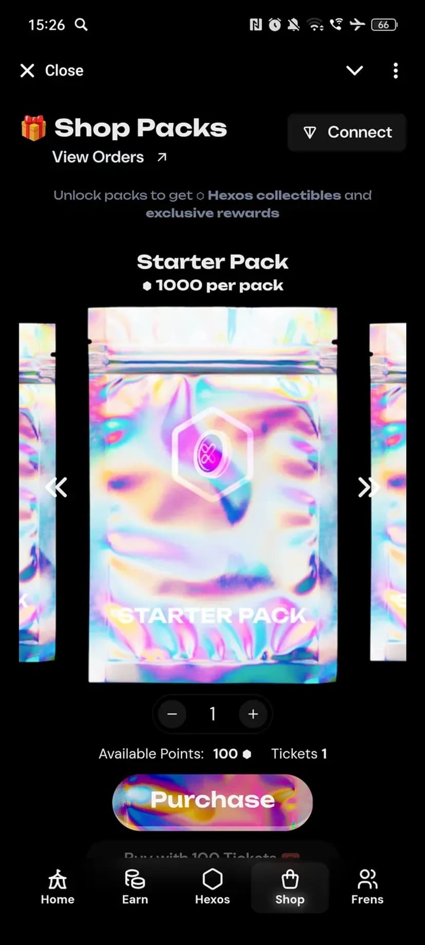 - Holo Packs: коробки с случайными призами — от предметов Hexos и криптовалют до NFT и подписок.