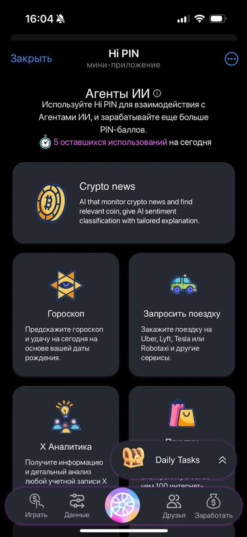 - Основные функции: бронирование такси, проверка гороскопа, онлайн‑шопинг, управление подписками, анализ расходов, социальные опросы, тестирование продуктов и подключение криптокошельков.