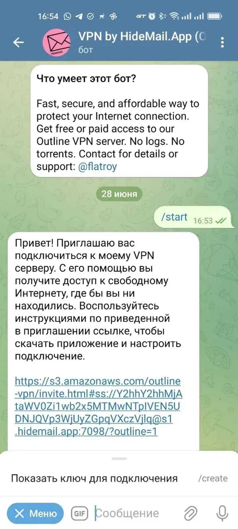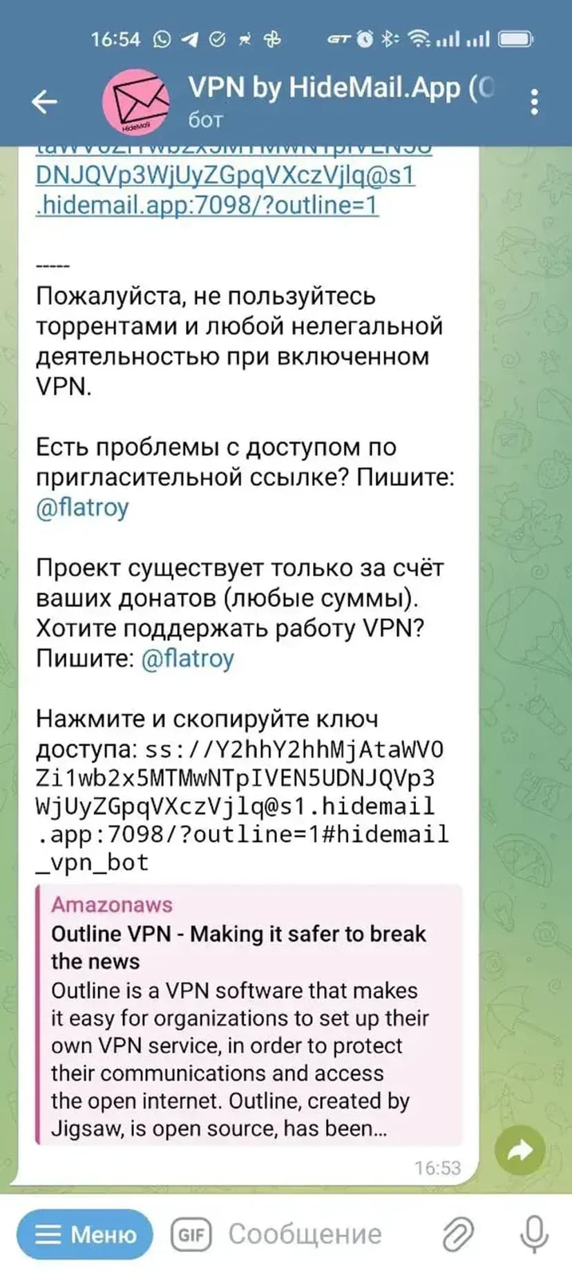 - Выбираете вариант доступа (бесплатный или платный) через Telegram-бот и получаете настройки сервера.