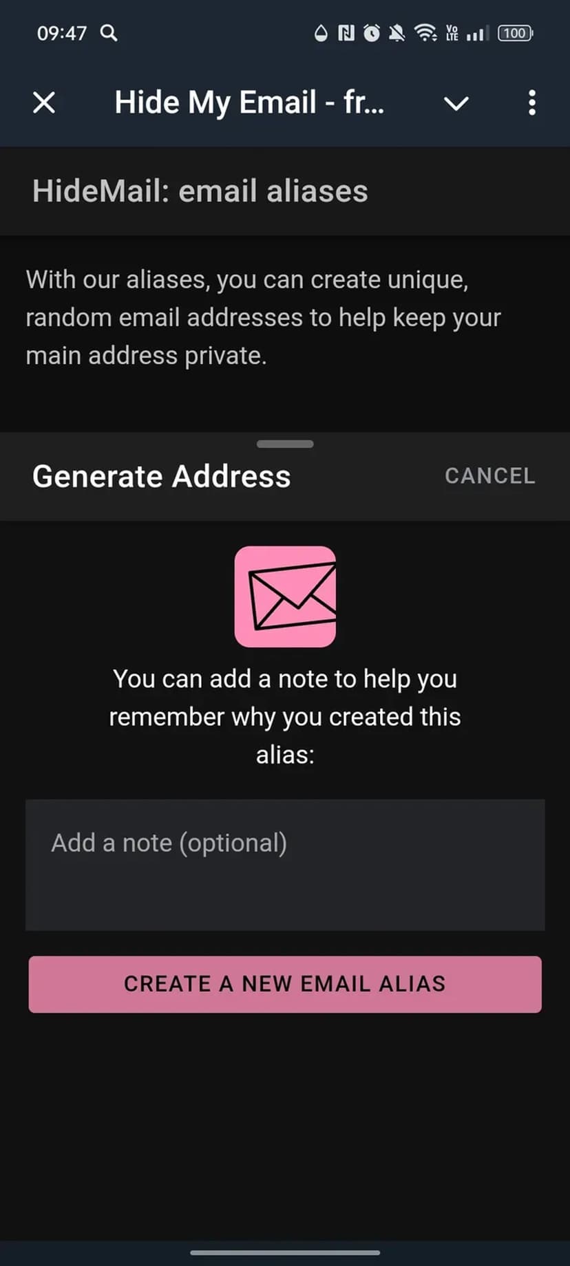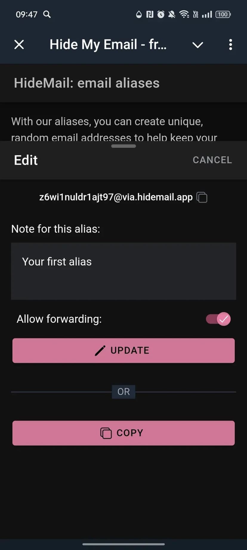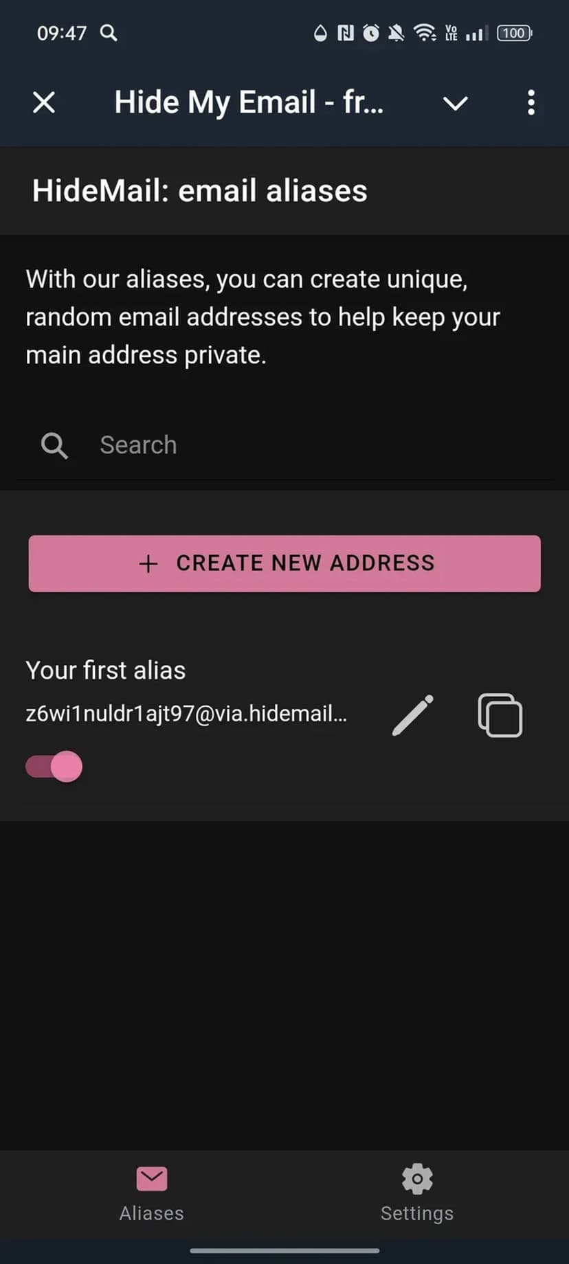 Hide My Email - free email aliases forever позволяет создавать уникальные временные email-адреса-алиасы для регистрации на сайтах и приложениях. Все входящие письма автоматически пересылаются в чат Telegram, что избавляет от использования основного почтового ящика при регистрации на сторонних ресурсах.
